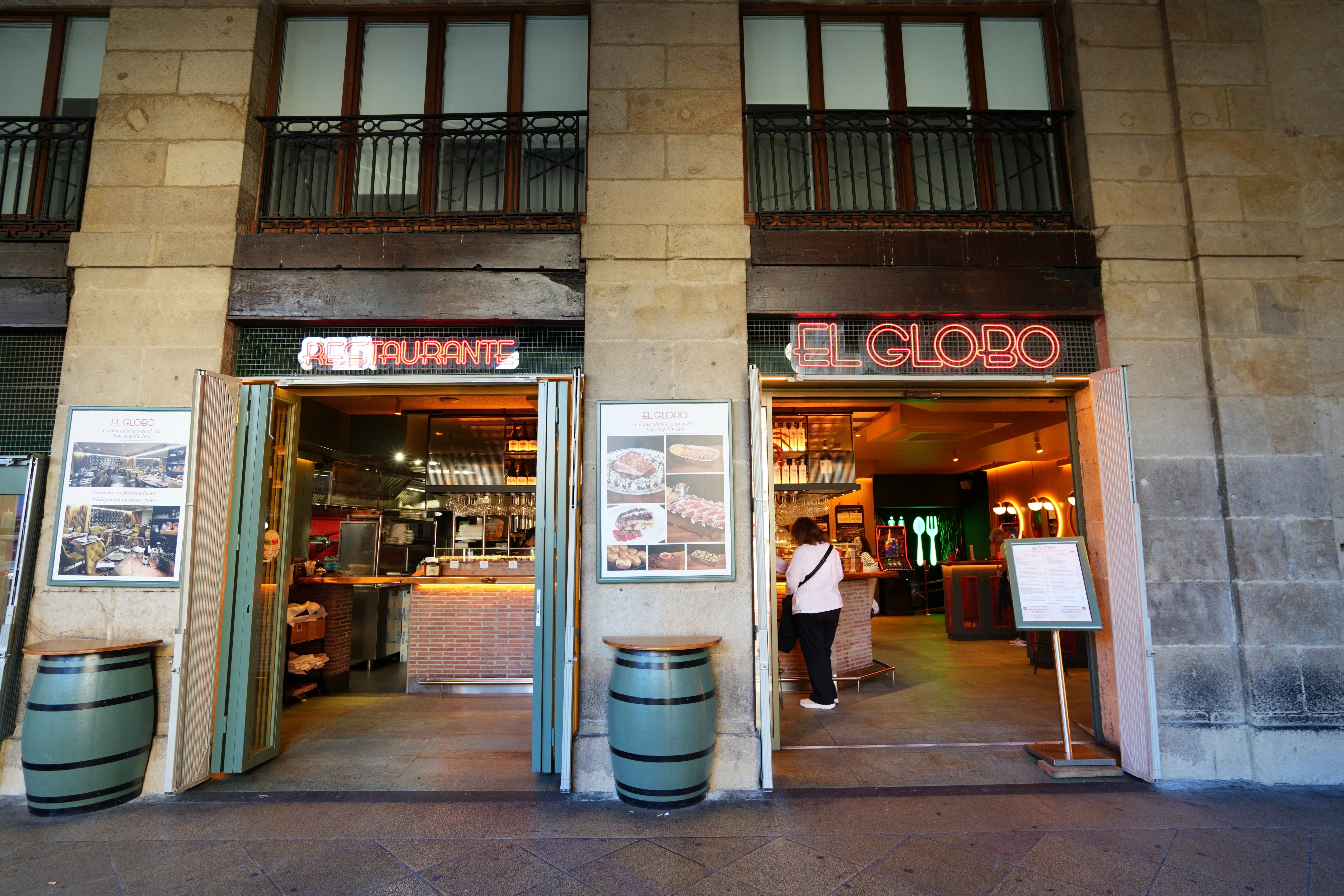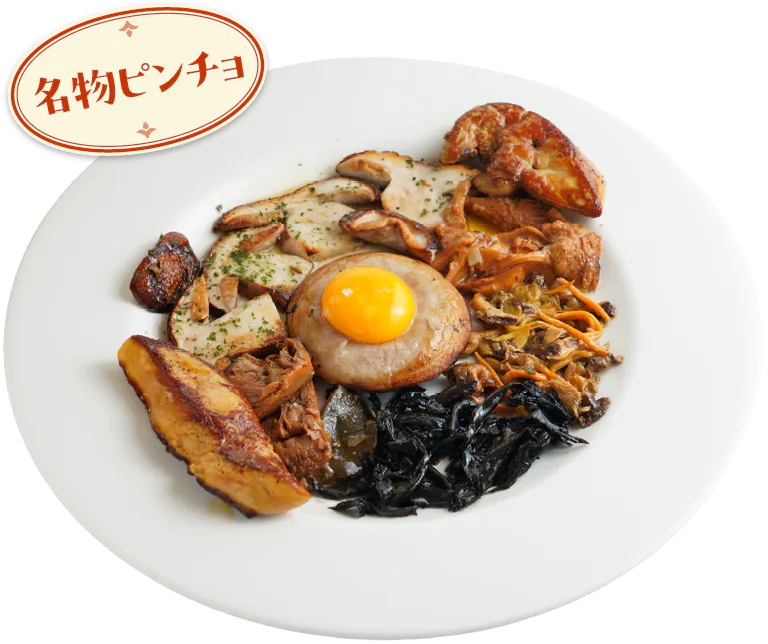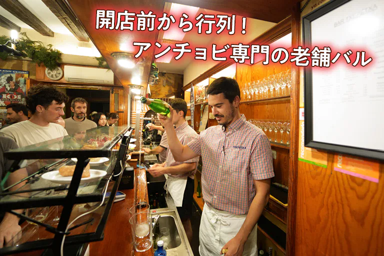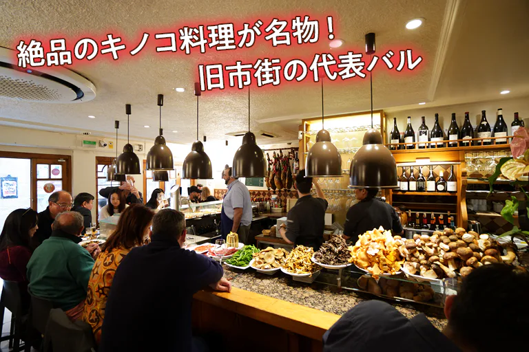 旧市街を代表する老舗バル。カウンターには新鮮な魚介や肉料理のピンチョがずらりと並び、地下はテーブル席があるのでゆっくり食事をしたい人におすすめ。キノコなど地元の旬の食材を生かした料理が豊富で、開店直後から行列ができるほどの人気ぶり。
