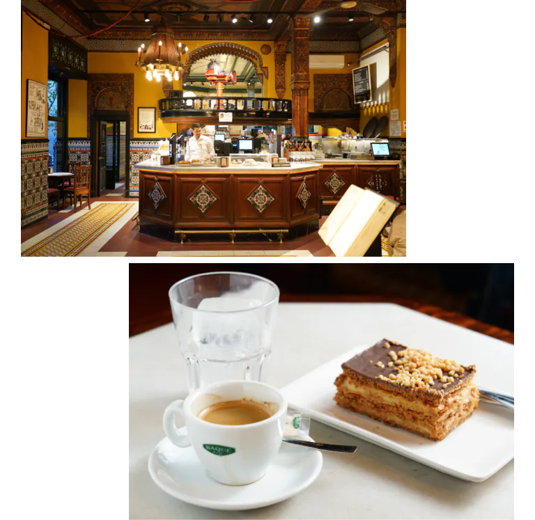19世紀創業の歴史あるカフェ。アルハンブラ宮殿をモチーフにした内装や、ムデハル様式の美しいタイル装飾に囲まれ、優雅なひとときを過ごすことができる。バルとしての利用も可能で、夕方ごろからピンチョが並ぶ。
