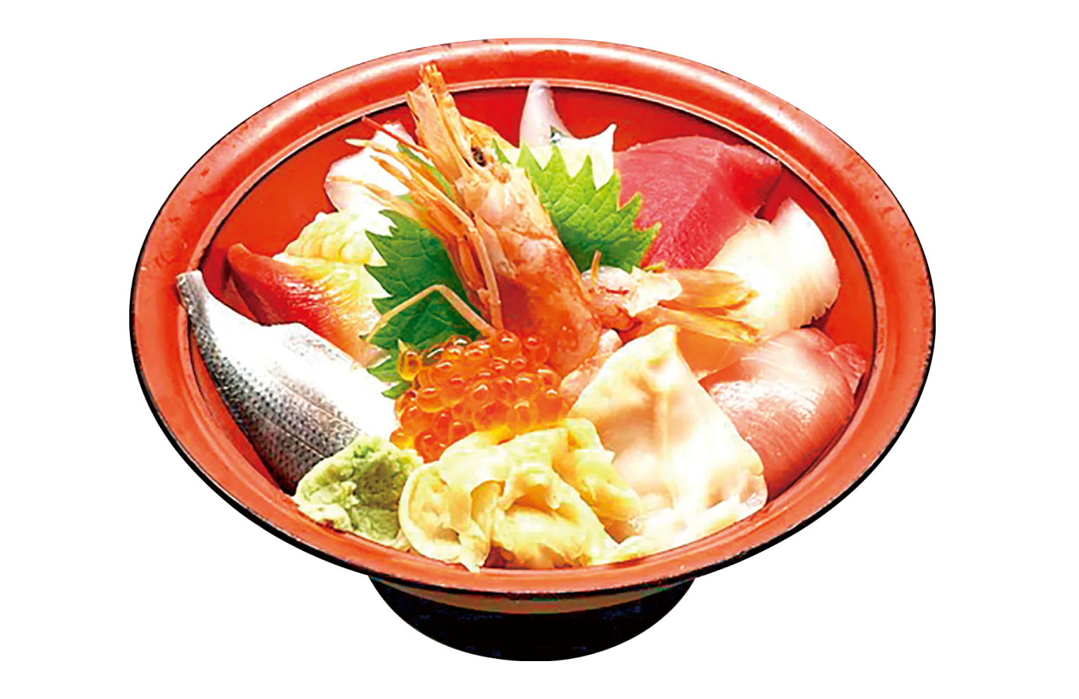 旬の海産物や「春つげやさい」が彩りよく盛り付けられた丼。一口食べるたびに新鮮な春の味が口いっぱいに広がる。