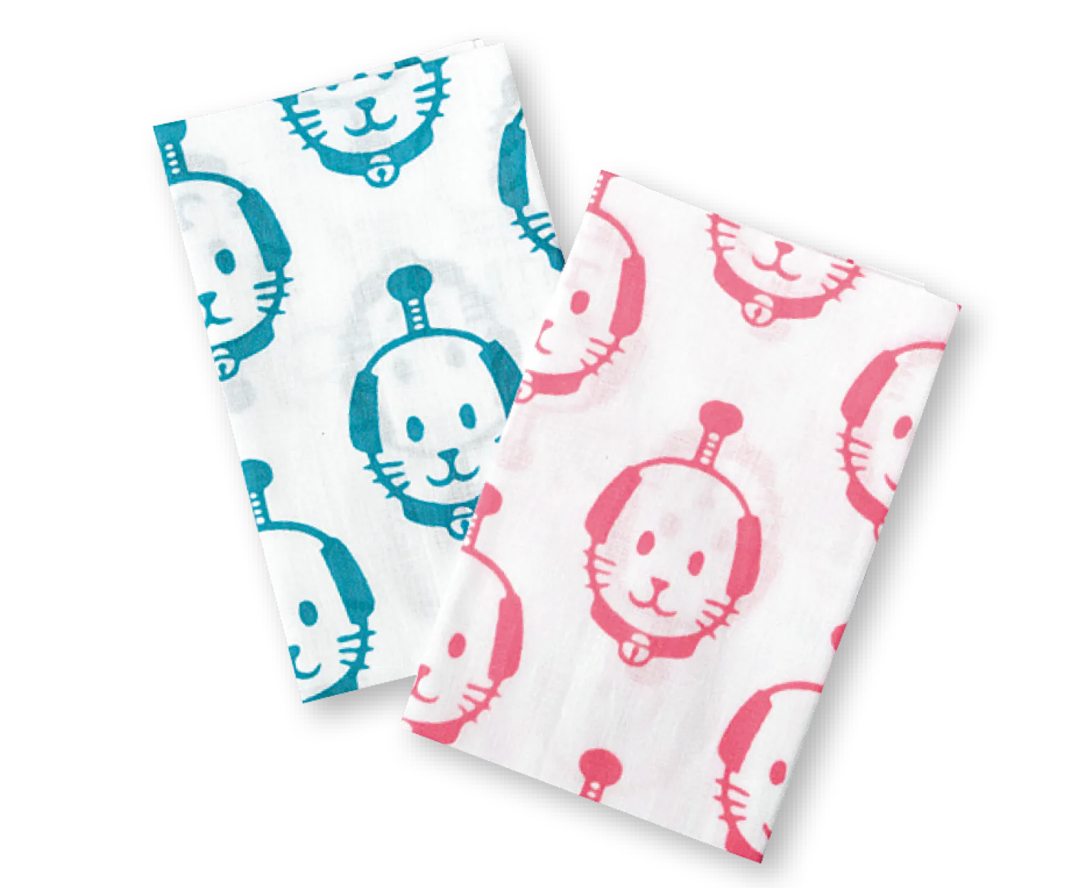 ニャンまげの顔がプリントされた手拭い。青とピンクの2種類ある
