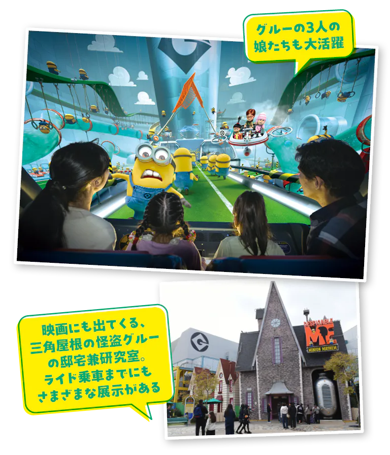 大人気のミニオンをメインとしたエリア「ミニオン・パーク」の一番奥にあるアトラクション。怪盗グルーの邸宅兼研究室を舞台に、グルーが発明したビークルに乗り込んだらミニオンになるための奇想天外なトレーニングがスタート!研究室を駆け回ったり、思いっきりハジけ飛んだり、地の果てまで真っ逆さまに落ちたり…と大忙し。3Dメガネなしでリアルなミニオンたちの動きを堪能でき、巨大ドームスクリーンに映し出されるミニオンの世界に釘付けだ。かわいくておかしくてハチャメチャな大騒動を楽しもう。