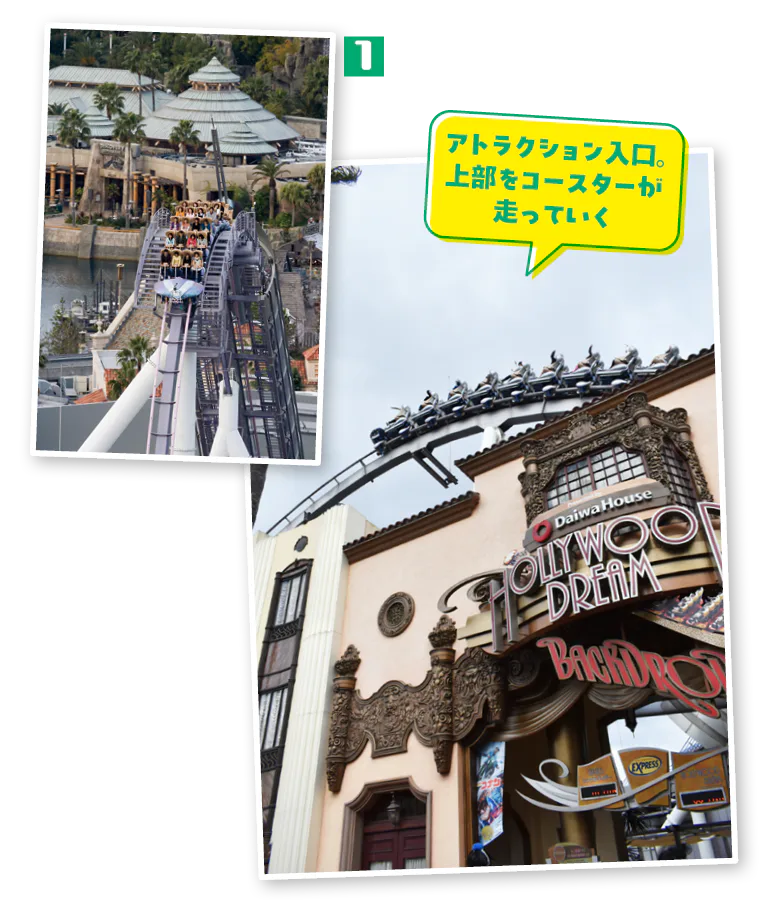 入園ゲート近くを駆け抜ける、USJのランドマーク的コースター。長さ1kmを超えるコースはパーク外まで飛び出しており、入園前から目に入るためドキドキワクワク感を刺激する。好きな楽曲をセレクトし音楽に包まれながら乗車できるなど、ほかのコースターにはない演出もユニークだ。コース上の「コブ」による無重力状態や、旋回中に生まれる強烈な重力など絶叫ポイントも多数で、最高地点からの落下時に見えるパーク内や大阪の風景とのマッチングは感動的だ。同じコースを後ろ向きに走る「ハリウッド・ドリーム・ザ・ライド ~バックドロップ~」もおすすめ。