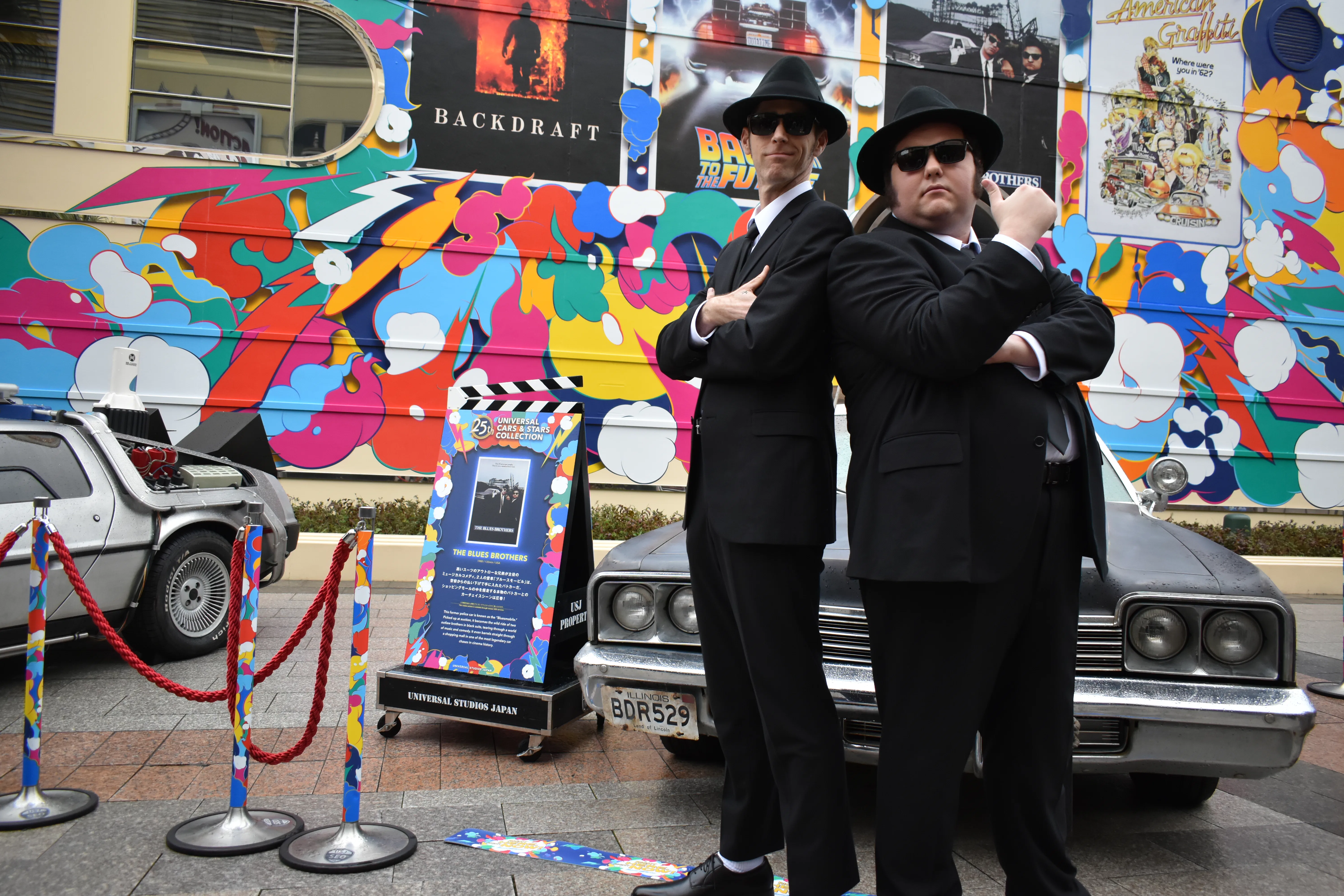 名作映画に登場した車を展示する「ユニバーサル・カーズ・アンド・スターズ・コレクション」にも注目。『ブルース・ブラザーズ』の大きな拡声器がついたブルースモービル、『バックドラフト』の消防車、『バック・トゥ・ザ・フューチャー』のタイムマシンと、どれもUSJ開業当時はアトラクションやエンタテインメントを実施していたものばかり。開業以来のファンにはたまらない演出だ。ジェイク&エルウッド兄弟やドク・ブラウンのグリーティングもあるので記念撮影を忘れずに。