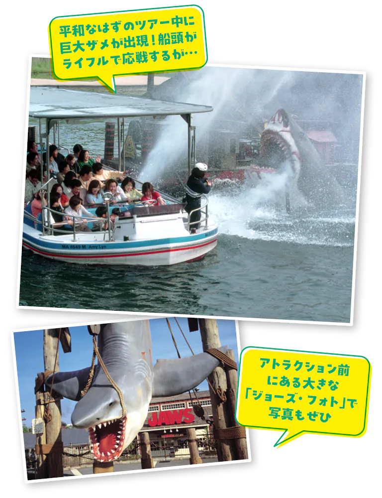 名作パニック映画『ジョーズ』の舞台となった漁村を忠実に再現した「アミティ・ビレッジ」にあるアトラクション。今では平和な港町…のはずが、乗り込んだ楽しいポートツアーに人喰いザメが現れ、恐怖のツアーへと一転…!ライフルでも炎の壁でも太刀打ちできない人喰いザメを相手に、果たして無事に戻ってこられるのか?! 巨大なサメはかなりの迫力で、ビギナーでもリピーターでもドキドキする展開だ。スリルや恐怖感をさらに味わいたい人には、日没後の時間帯でのライドがおすすめ。