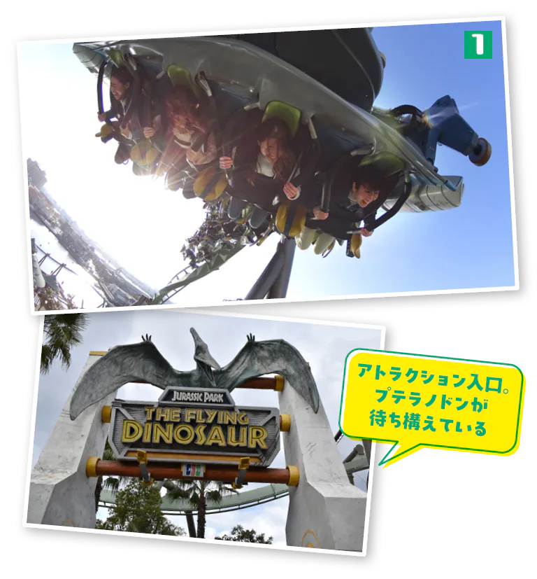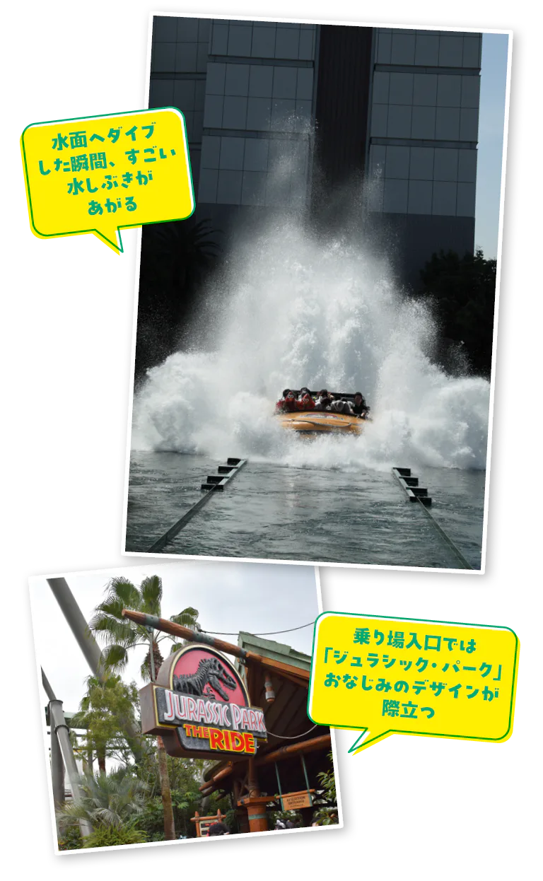 開業当初から人気のウォーター系スリルライド。「ジュラシック・パーク」の世界で太古の恐竜たちとの出会いを楽しもう。冒険の結末、やはり最大の見どころはクライマックスの水面へのダイブ! びしょ濡れ必至のアトラクションだが、暑い日はぜひポンチョなしで水を目いっぱい浴びてほしい。また、ライドが25.9m下までダイブする瞬間をほぼ正面から見られる場所があり、タイミングが合えば「ザ・フライング・ダイナソー」のコースターが一緒に写り込んだ大迫力の写真を撮影できるそう。フォトスポットとしても注目だ。