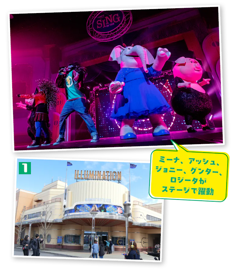 ハリウッドエリアの「イルミネーション・シアター」では、“すべての生き物のみなさま”に贈るシアター・ライブ・ショー「シング・オン・ツアー」を上演中!映画『SING』でお馴染みのキャラクターたちがステージで歌い踊る、本格的なライブミュージカルだ。映画を観たことがある人はもちろん、まだ観ていない人も十分楽しめる。シアタータイプなので座ってゆっくり見られるが、目の前で繰り広げられるパワフルな歌声やパフォーマンスは臨場感抜群で、ノリノリになれること間違いなしだ。