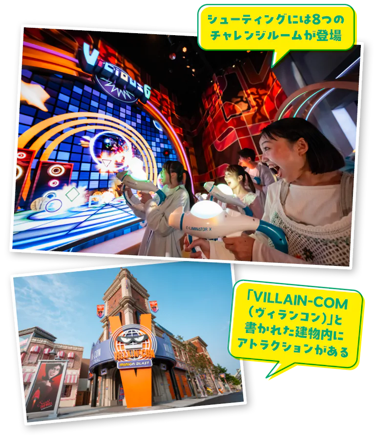 ワル中のワルたちが集う極悪イベント「大悪党大会」が開催!映画に登場するスーパー悪党グループ「ヴィシャス6」の新メンバーを目指して、最新鋭のブラスター「イーリミネーターX」を持ってシューティングで高得点を狙おう。ムービング・ウォークウェイ(動く歩道)に乗って、アイテムや悪党たちめがけてブラスターをぶっ放そう。専用アプリと連携すれば、ブラスターをカスタマイズできたり楽しさ倍増のうえに、高得点のチャンスもアップ!ぜひアプリをダウンロードして活用しよう。大悪党のコレクションのオークション会場になっている、アトラクション開始前の展示も興味深く注目だ。