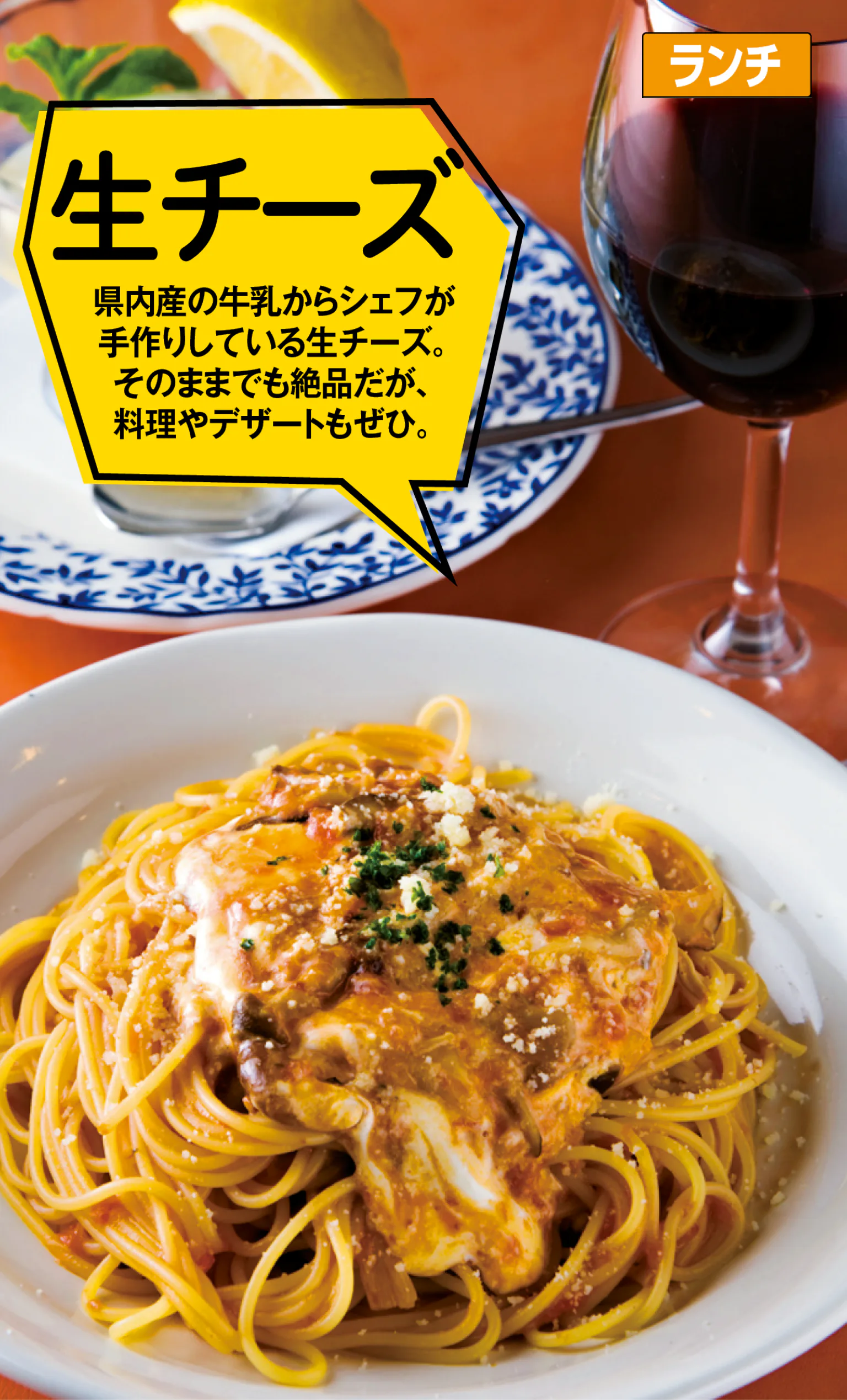 パスタやピッツァ、魚・肉料理など本格的なイタリアンが味わえる。料理のほか、デザートにも使われているのが、シェフ特製の生チーズ。特にトマトソース系の料理との相性は抜群で、コクがプラスされる。店内はシンプルで広々としている。