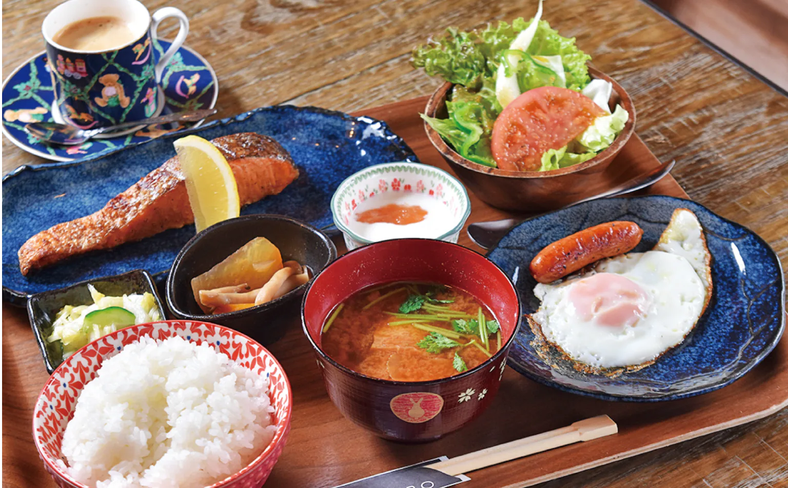 素泊まりの観光客にうれしい朝と夜のごはん専門店。焼鮭定食やトーストセットなど、ボリューム満点の朝食が味わえる。夜の上州牛のビーフシチューや赤城鶏のグリルなども人気。種類豊富なハーブティーコーナー(写真下)