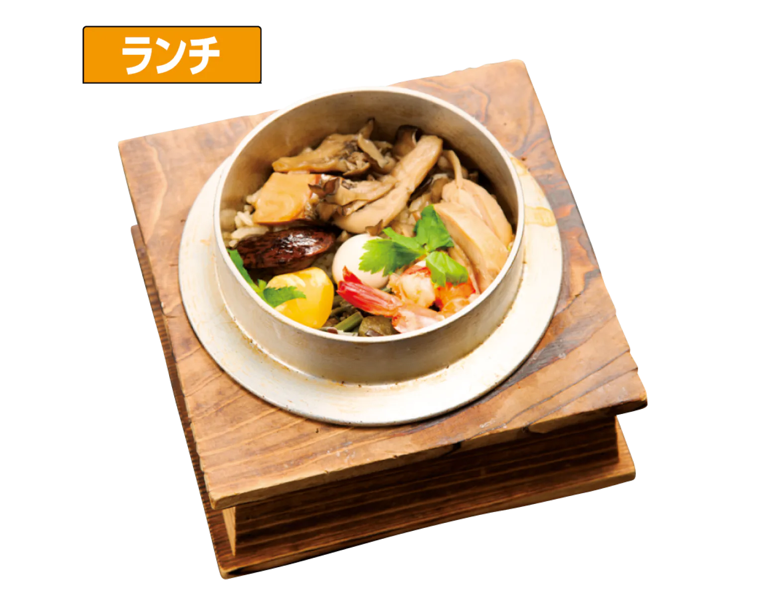 釜めしの専門店で、名物の花いんげん釜めしや舞茸釜めし1320円など、約20種類の釜めしが揃う。注文後から炊き上がるまでは約20分。釜のふたを開ければ、食欲をそそる香りが立ち上る。
