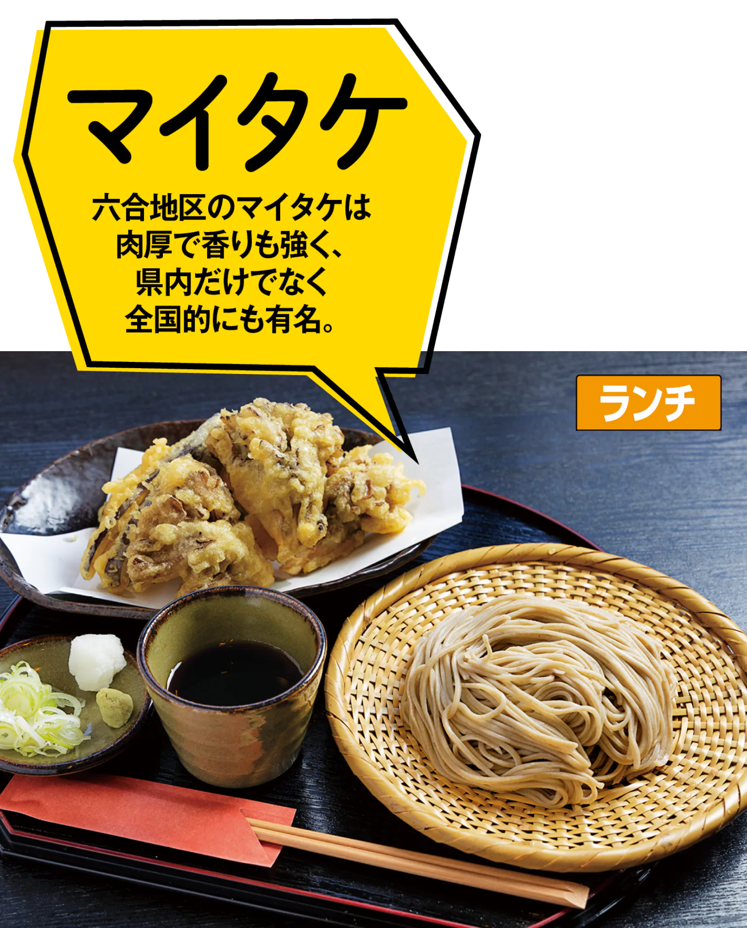 中之条町六合地区はマイタケの一大産地。そのうま味と食感を楽しめる天ぷらが付いたもりそばが人気。もりそばの量(1~4人前)と6種類のつけ汁を選べるスタイルも評判。そばは2人前から鉢に盛られ、金額も少しお得に。建物の2階にあり、窓から湯畑が見える。
