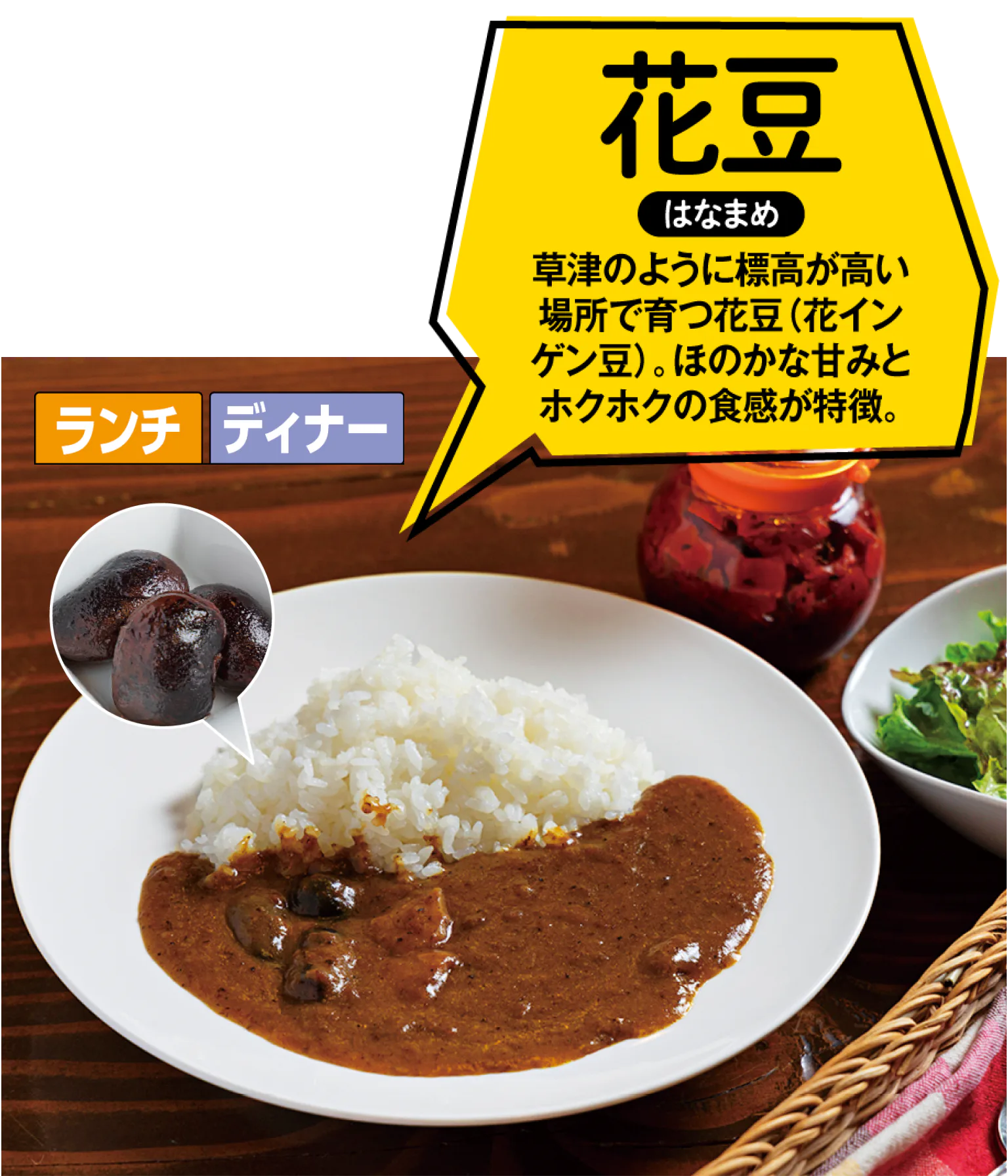 群馬特産の赤城牛や花豆を使ったカレーが人気のレストラン。花豆とフルーツのカレーは、花豆を事前に5時間煮て、マンゴーとパイナップルを加えたコクのある甘口カレー。中辛の赤城牛のプレミアムビーフカレー1600円もおすすめ。