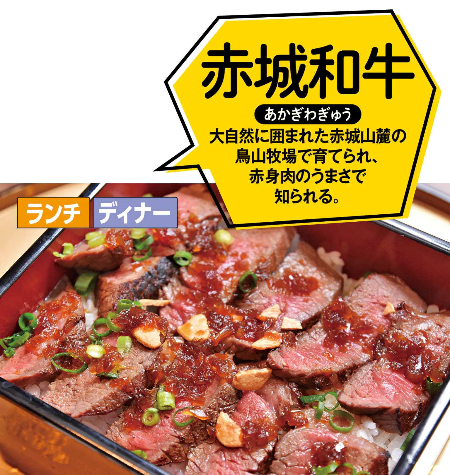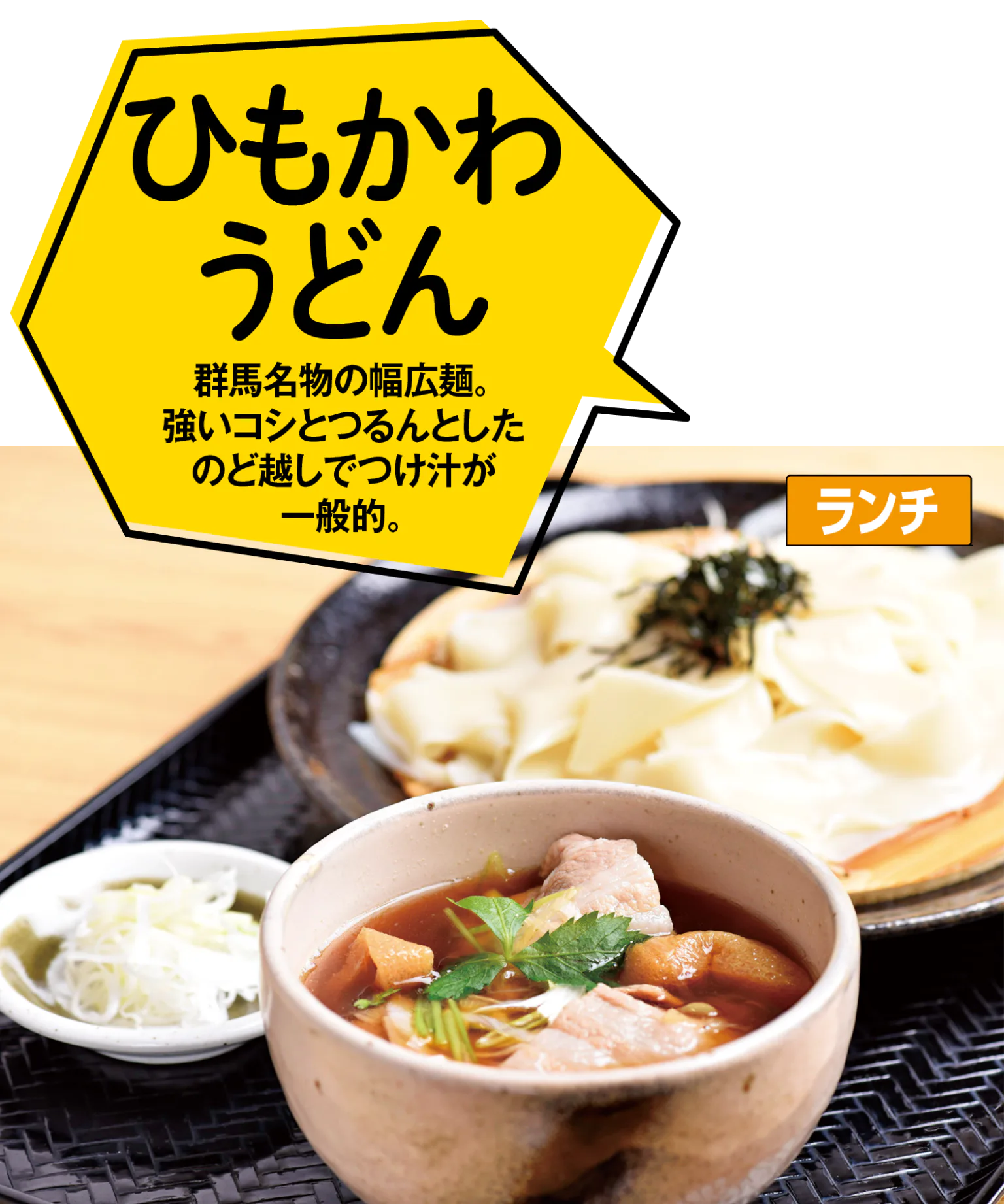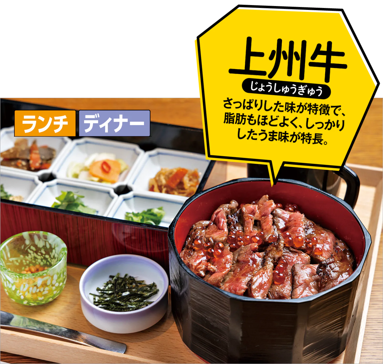 花インゲン豆やマイタケをはじめ、上州牛や赤城和牛などのブランド肉、地元の食材などを使ったグルメをご紹介。