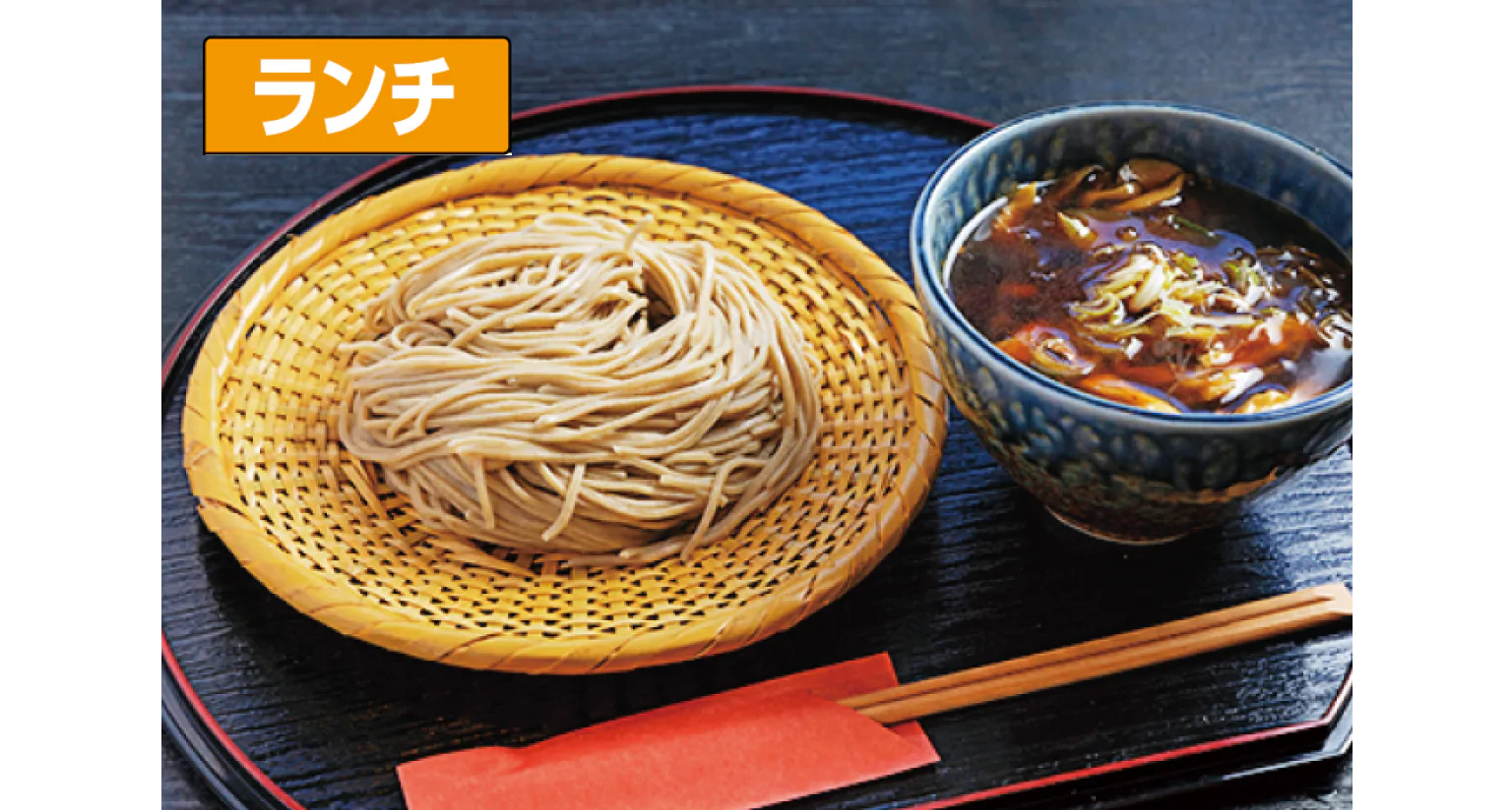 写真はそば1人前+まいたけ汁。つけ汁は、つくね、鴨なんばんなど温冷6種類