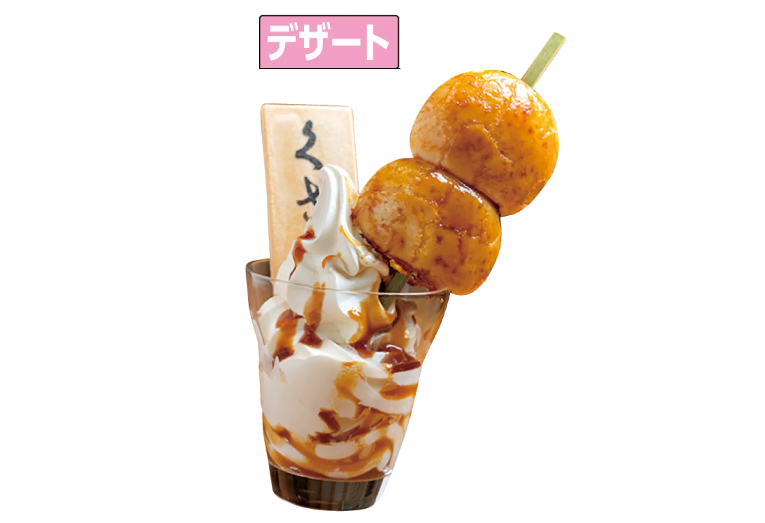 ソフトクリームと味噌ダレがかかった焼きまんじゅうのコラボ