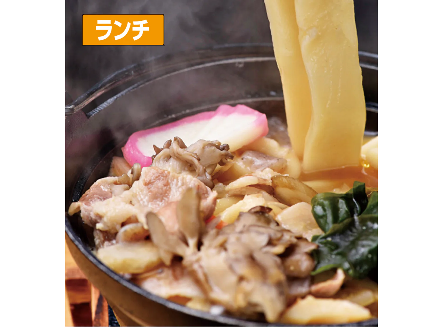 群馬県産の地粉「絹の華」を使ったひもかわうどん専門店。幅2㎝ほどの平打ち麺は、冷製ならより粉の味や香りが引き立つ。寒い時期には、鍋で出てくる郷土料理のおっきりこみ(10月中旬~5月上旬限定)を季節の天ぷらとともに味わいたい。店は木を基調にした造り。