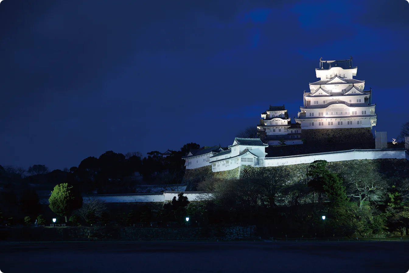純白の天守を照らすライトアップ