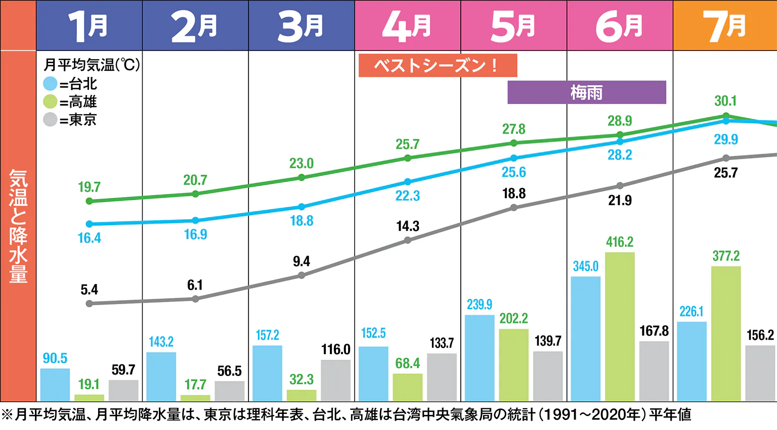 台湾の北部に比べ2~4℃ほど気温が高く、日中は日本の春並みの陽気。夜は冷え込むので軽く羽織れる上着があると便利。