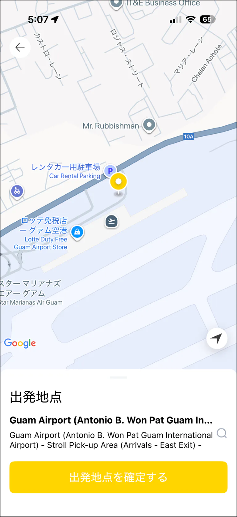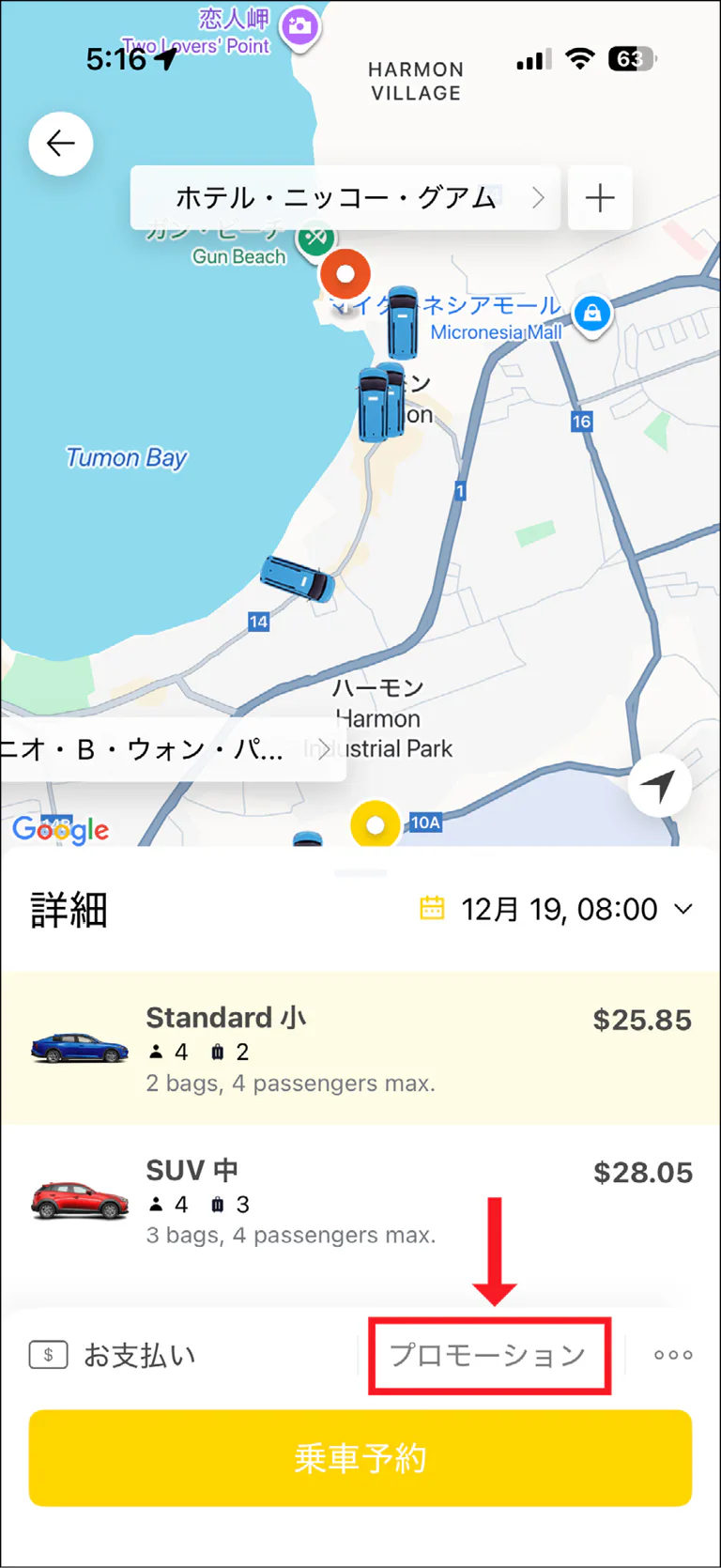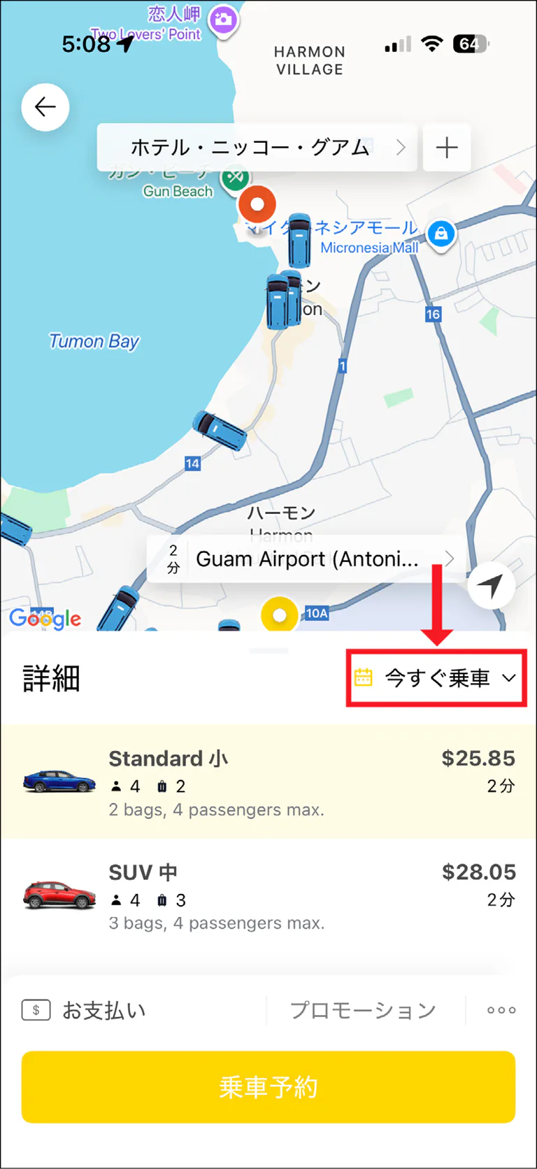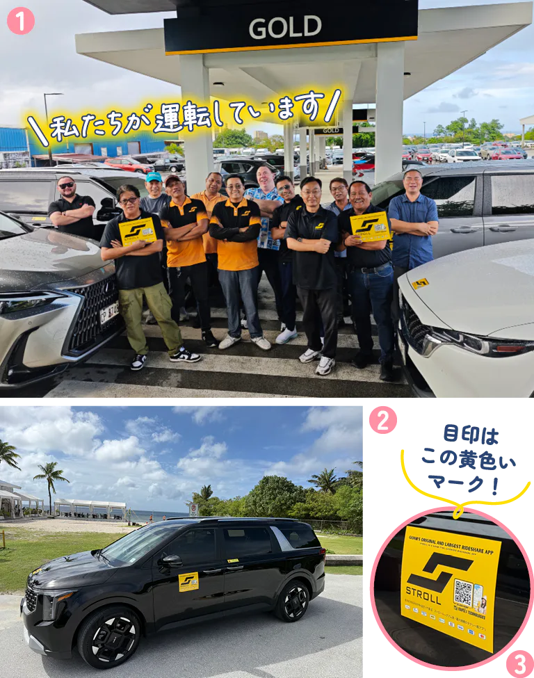 ※グアム国際空港から乗車する場合、「グアム空港」で検索して「Guam Airport-Stroll Pick-up Ariea」という選択肢を選ぶ。地図にピンが立つので、空港到着後、どこで車を拾えばよいのかが一目で分かるので便利。
