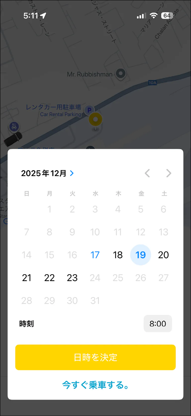 初期画面は「今すぐ乗車」になっているので、すぐに利用する場合はこのままでOK。配車予約をする場合は、左のカレンダーマークをクリックして乗車日時を選択する。