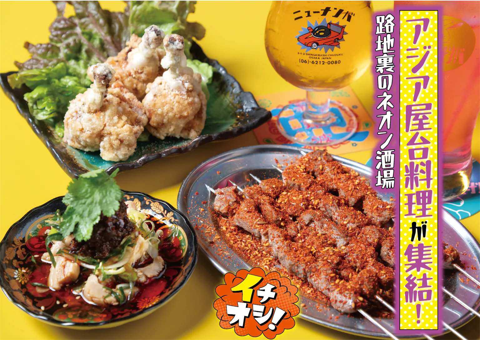 ポップな雰囲気の店内で、アジア各地の屋台料理を提供。北海道から仕入れるラムなど、こだわりの素材を使った本格的なエスニック料理がリーズナブルに味わえる。大阪のシンボルを描いたポップな壁画がインパクト大。