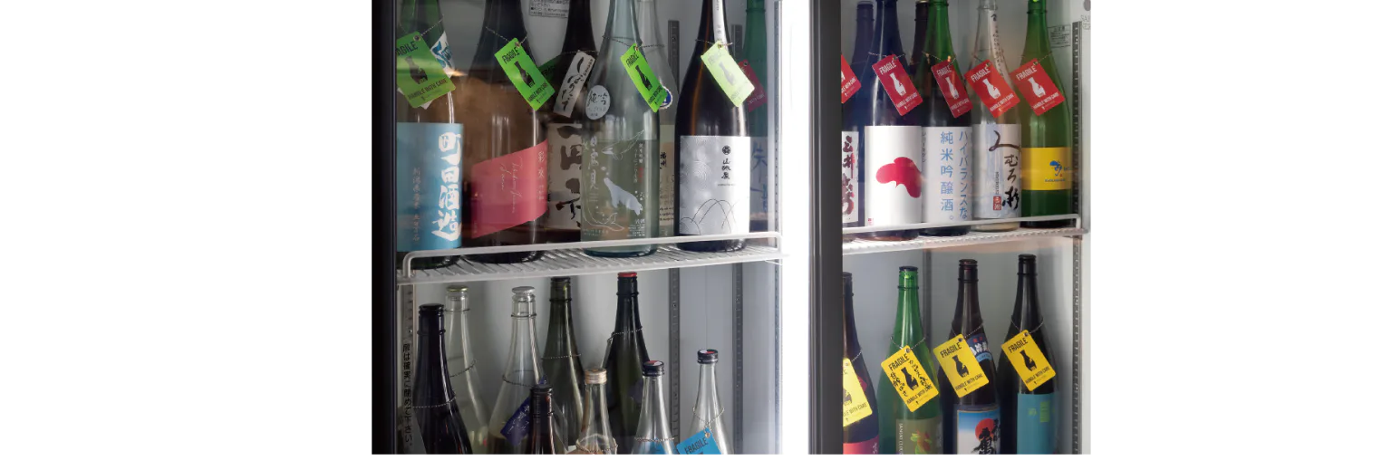 日本酒はグラス590円~。冷蔵庫から自分で取るシステムで、フダの色で価格が異なる