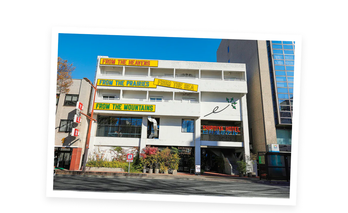 1970年代の建物をリノベーションしたヘリテージタワーの外観には、ローレンス・ウィナーの作品が飾られている