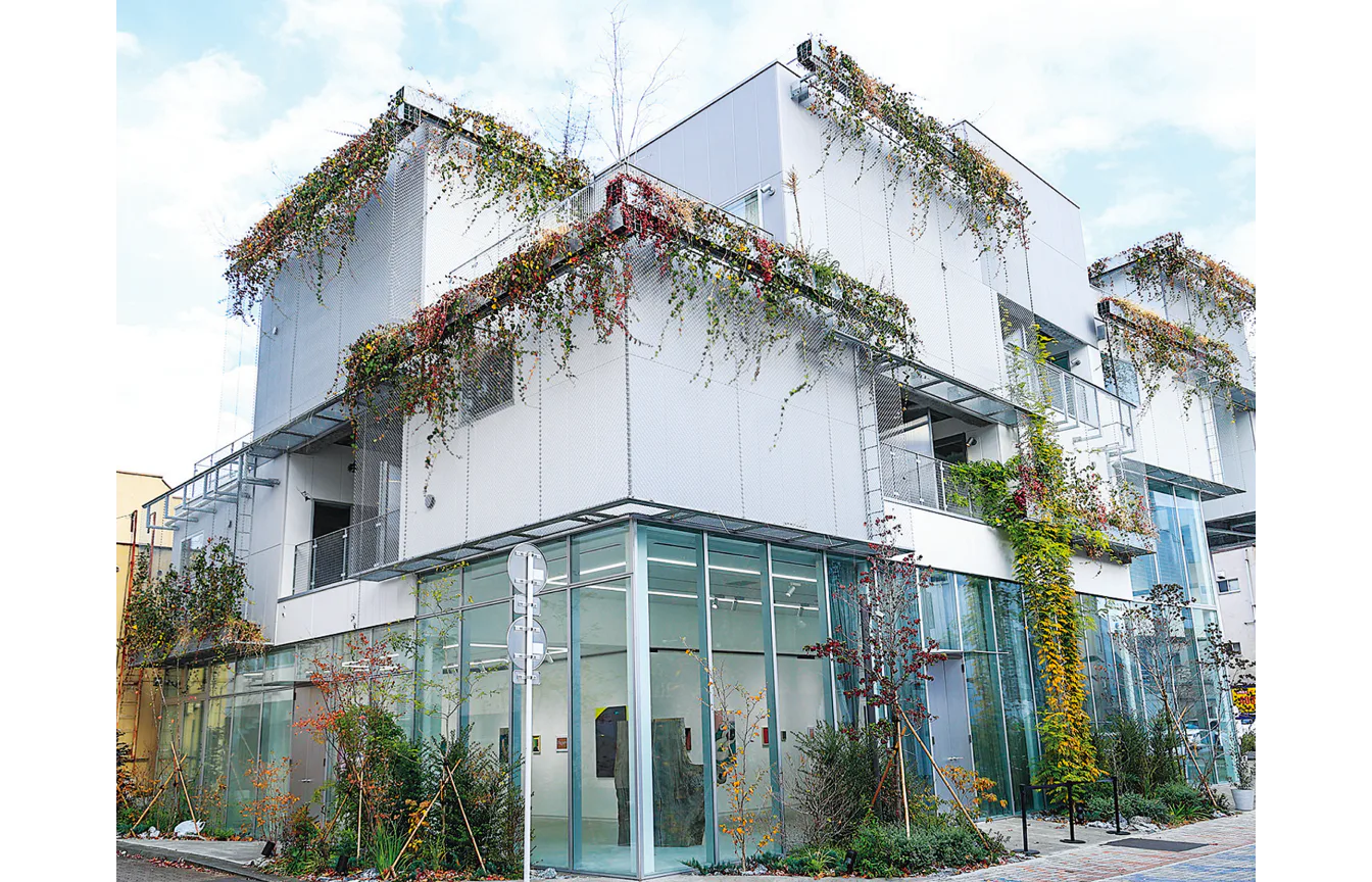 緑あふれる丘のようなフォルムが特徴的なグリーンタワーは利根川の旧河川の土手をイメージして設計。建物全体を覆うように設置された緑のファサードはまるで森の中にいるような感覚に。季節によって違った表情を見せてくれる。