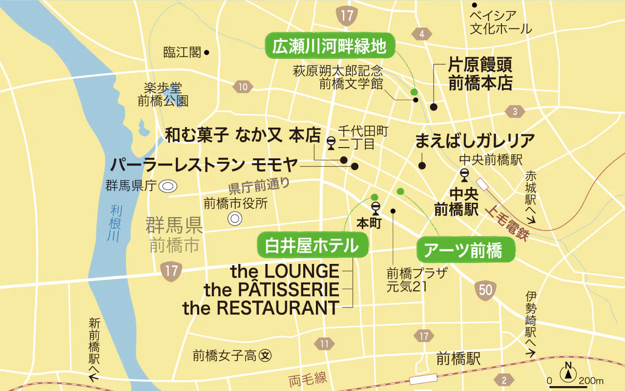 JR前橋駅から白井屋ホテルなどがある市の中心部へは歩いて行けるが、前橋駅から路線バス(関越交通バスなど)の利用も可能。上毛電鉄の中央前橋駅まで7分、千代田町二丁目まで5分、本町まで3分。