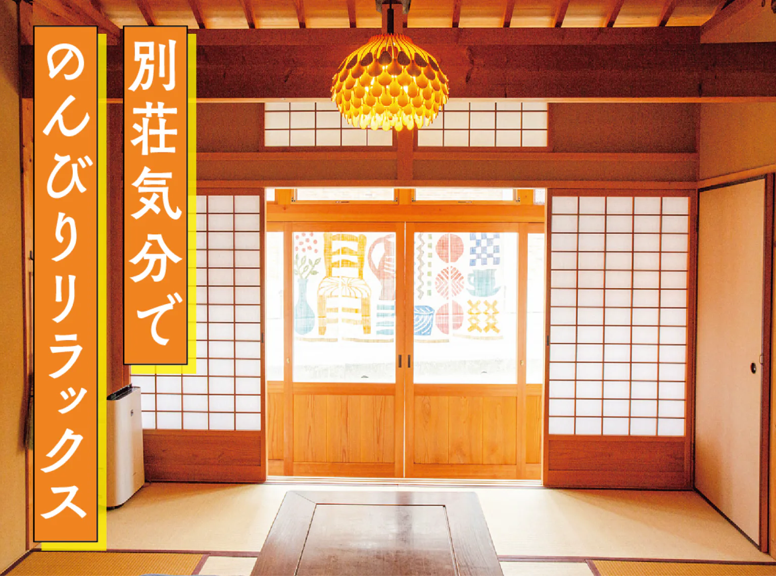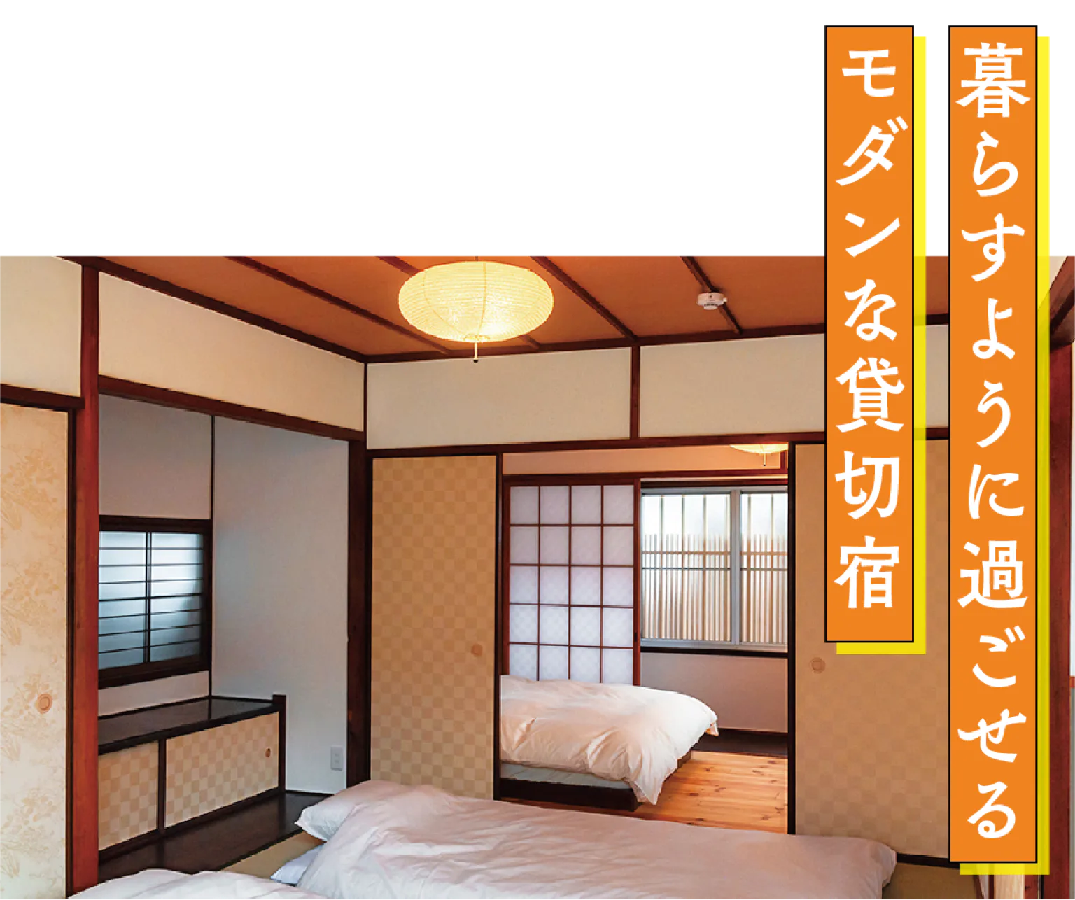 本町通りに立つ江戸時代後期の民家を改装した町家旅館。天井や障子などに名工の粋をちりばめた和の空間や、檜(ひのき)や高野槙(こうやまき)の貸切風呂で上質な時を。瀬戸内の食材を生かした料理も評判。写真は6畳+3畳の楓の間。アーチ状の壁が特徴的。