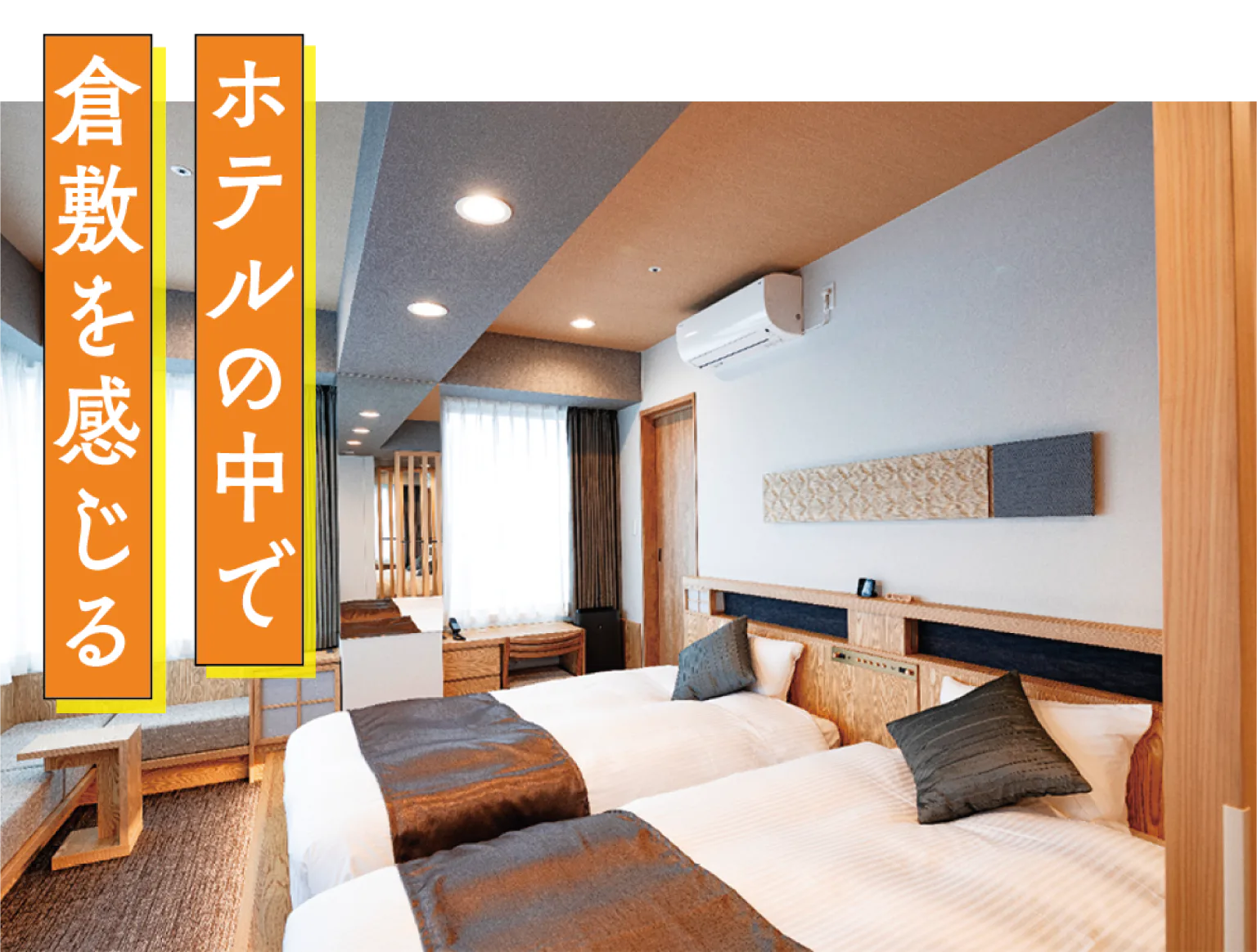 岡山らしさを取り入れた客室で五感で倉敷を体験しているような感覚を楽しめる。レストラン「くらしき白壁」や宴会場も備える。駅から近く観光の拠点に便利。丹下健三氏デザインのイージーチェアが配されたロビーで寛ぐのもいい(写真上)。