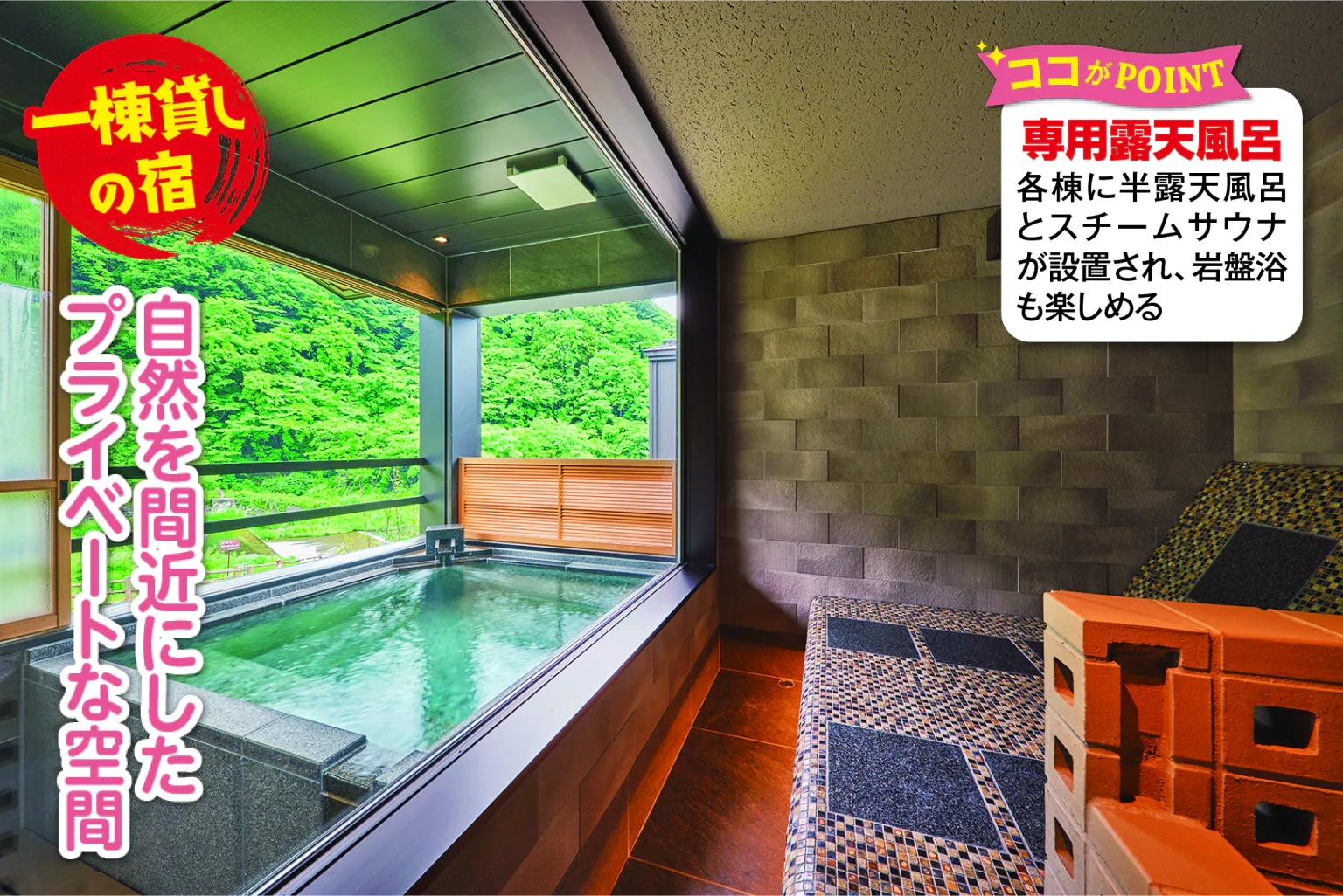 源泉かけ流しの半露天風呂。サイドにはプライベート岩盤浴ブースもある
