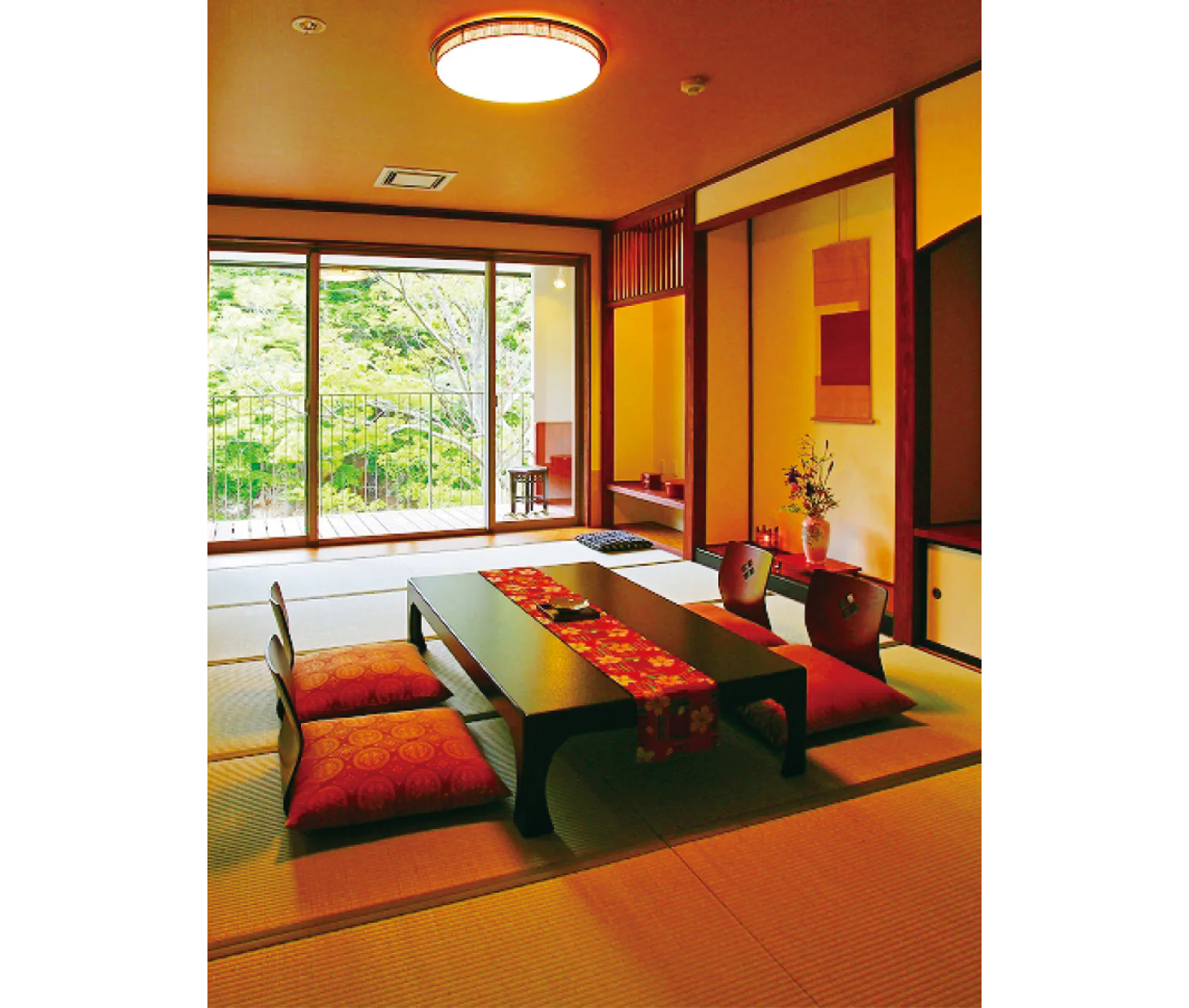 和室、車いす対応洋室、露天風呂付きなどの客室を備える