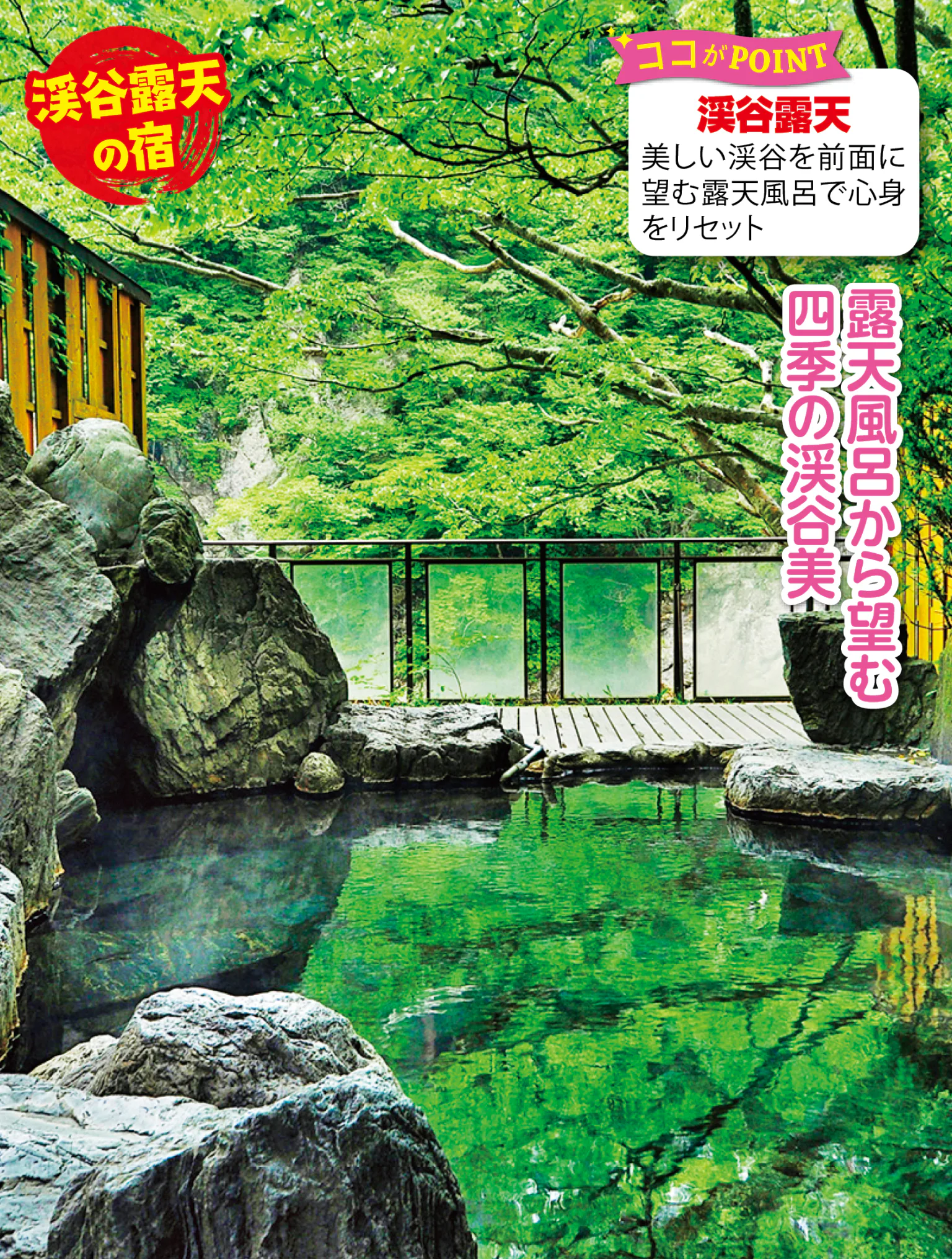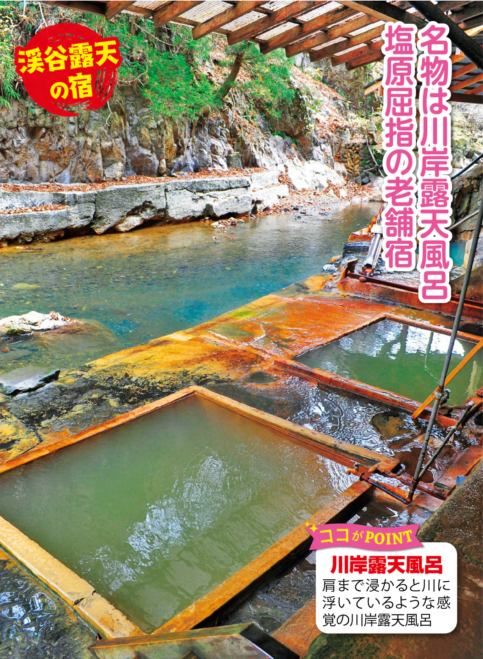 塩原温泉郷の醍醐味は渓谷・グルメ・秘湯。 渓谷美を堪能できる「渓谷露天の宿」、旬の食材にこだわる「絶品料理の宿」、1200年の歴史を体感できる山奥にある「秘湯の宿」。どれも魅力的だ。