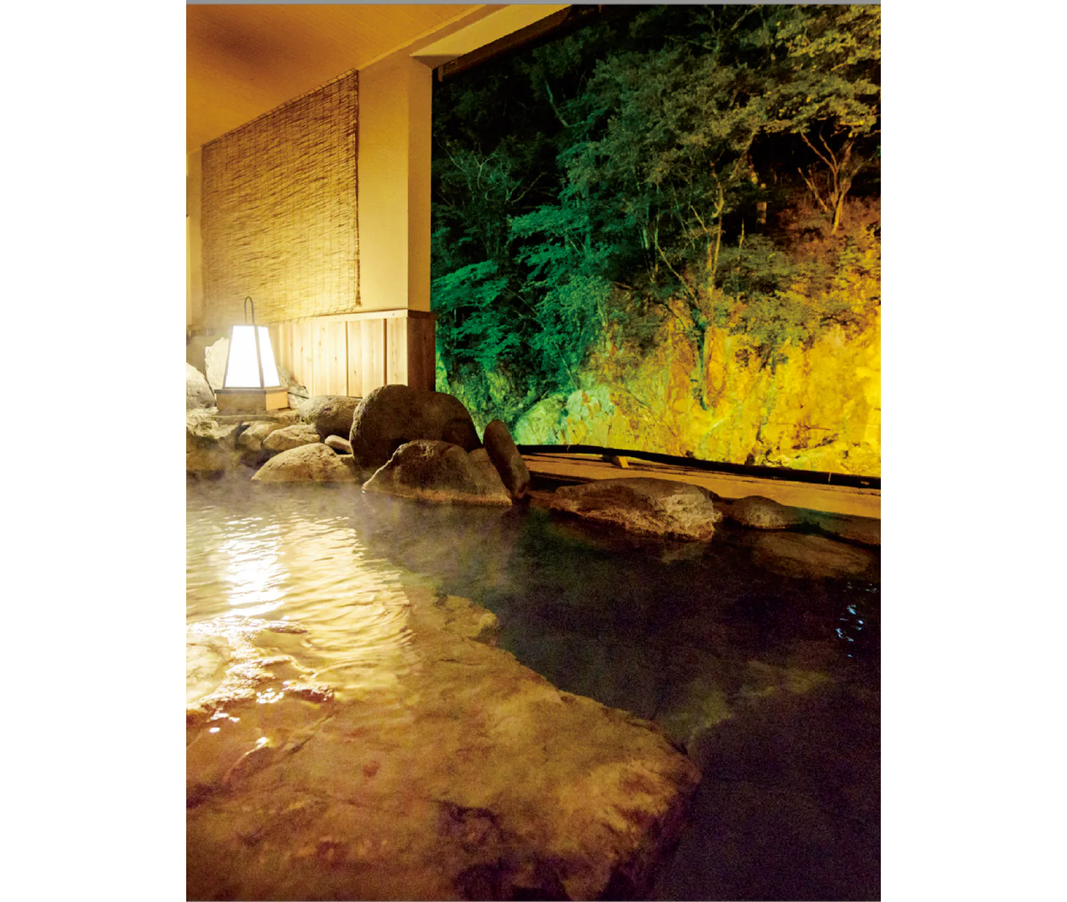 日本で唯一という鉄分豊富で真っ黒な「墨の湯」、天候などでお湯の色が変わる「五色の湯」を備え、珍しい温泉を利用できる。ほかに野天風呂や家族風呂などもある。