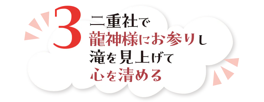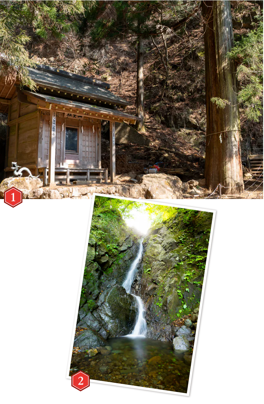 1.御神木が立つ二重社。御朱印は大山阿夫利神社下社の授与所で 2.上下二段になっていることから名付けられたと伝わる二重滝には龍神伝説が残る