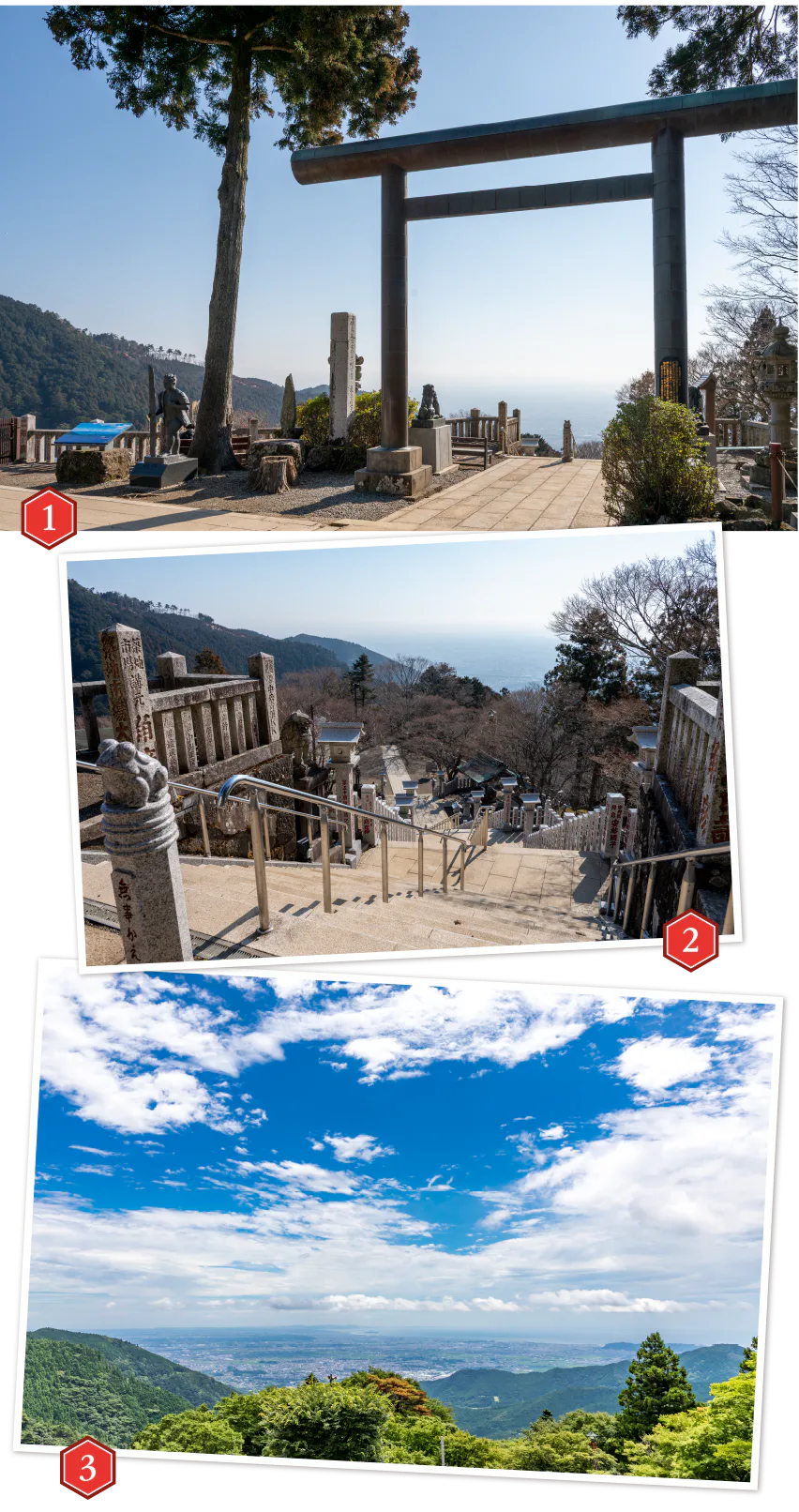 1.大鳥居からのダイナミックな景色に感動! 2.長い階段を登って大鳥居へ 3.大鳥居横のベンチからの眺めは時間の経つのを忘れるほど