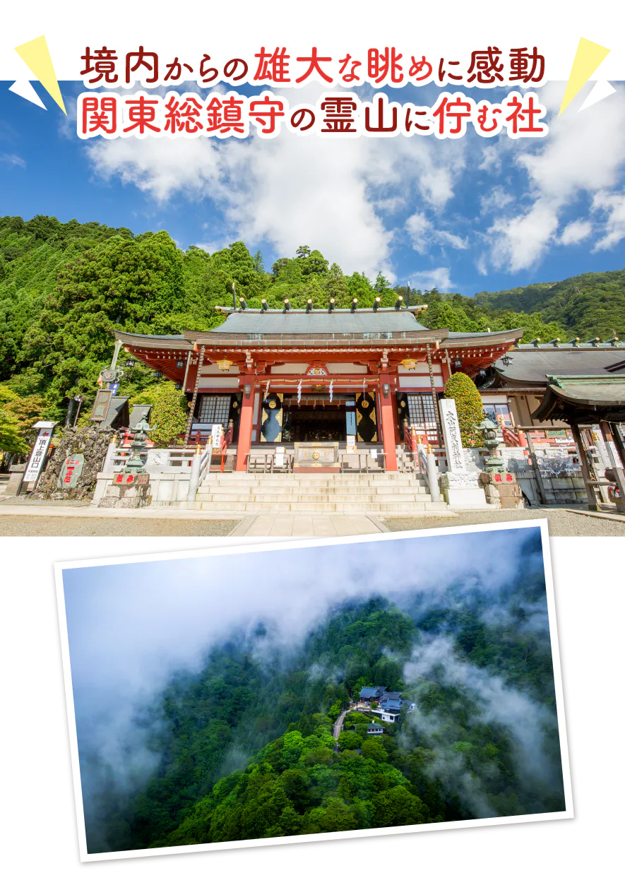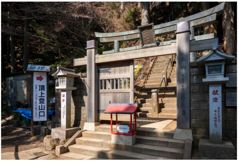 標高約1252m大山の山頂に立つ本社までは、登山道で片道約90~120分。下社の拝殿奥に登拝門(写真下)とよばれる登山道の入り口があり、入山修祓料の100円を納め、自身でお祓いをしてから山頂へ向かう。途中には樹齢500~600年の夫婦杉や富士山の眺望などが楽しめるポイントがあり、雄大な自然を楽しめると人気だが、本格的な登山道のため、山歩きの装備をして行こう。本社には売店とトイレがあるが、時期により閉じていることがあるので事前に確認を。