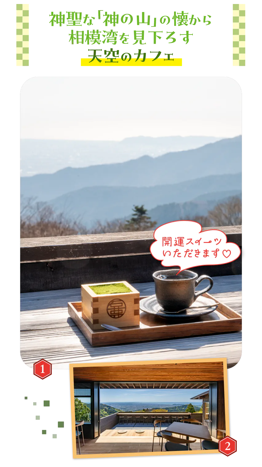 店名の由来は「石尊さま」と呼ばれた御神体の大きな自然石。大山阿夫利神社下社の大鳥居横にあり、テラスのカウンタ―席からは絶景が一望できる贅沢なロケーション。山内に湧く御神水で淹れるコーヒーと、縁起物の升に入ったまろやかな口どけの「升ティラミス」をいただき、体の中から運気アップ!