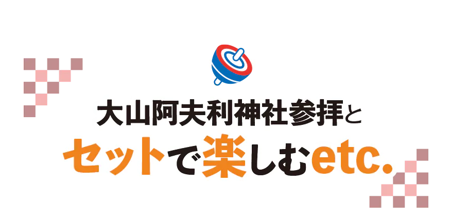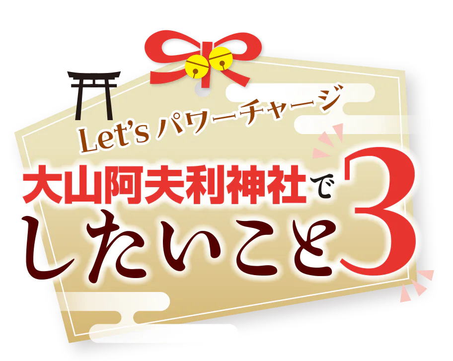 大山ケーブルのバス停から「こま参道」を抜け、ケーブルカーを利用して大山阿夫利神社下社の境内へ。境内からの絶景を堪能しながらゆっくり参拝してパワーチャージした後は、境内グルメで更にエネルギーチャージ。その後はかわらけ投げの厄落としで人気の大山寺へ、ケーブルカーで移動するのもよし、新緑や紅葉の季節には「女坂」の“七不思議”を探しながら大山寺まで徒歩で移動(約20分)するのもおすすめ。女坂といっても急坂の階段が続くので、履きなれたスニーカーと、動きやすい服装がベスト。大山寺から大山ケーブル駅まで徒歩20分ほどで下ることができる。大山寺からケーブルカーを利用して下山する場合、登山者が下山してくる15時以降は混雑しやすいので、時間に余裕をもって行動したい。阿夫利神社下社だけの参拝なら食事やお茶の時間を含め約3時間ほど。山頂の本社まで足を延ばす場合は1日みておきたい。