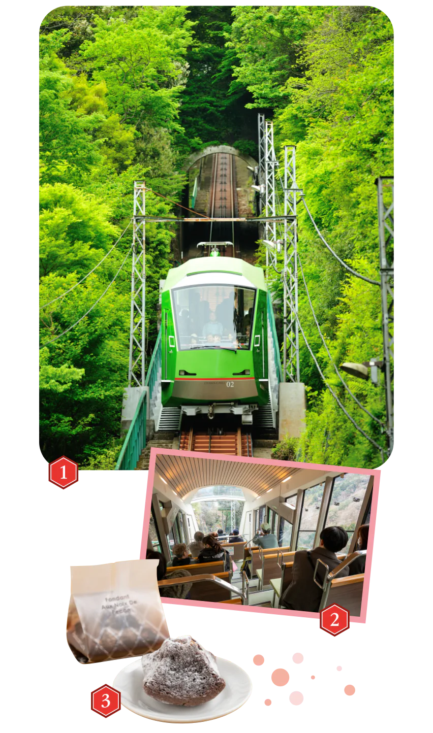 1.急斜面を一気に上がり迫力満点 2.大きな窓からの眺めも素晴らしい 3.伊勢原市にある人気パティスリー「パスティッチェリア・ラッテ」の小麦粉を使用しないスイーツ