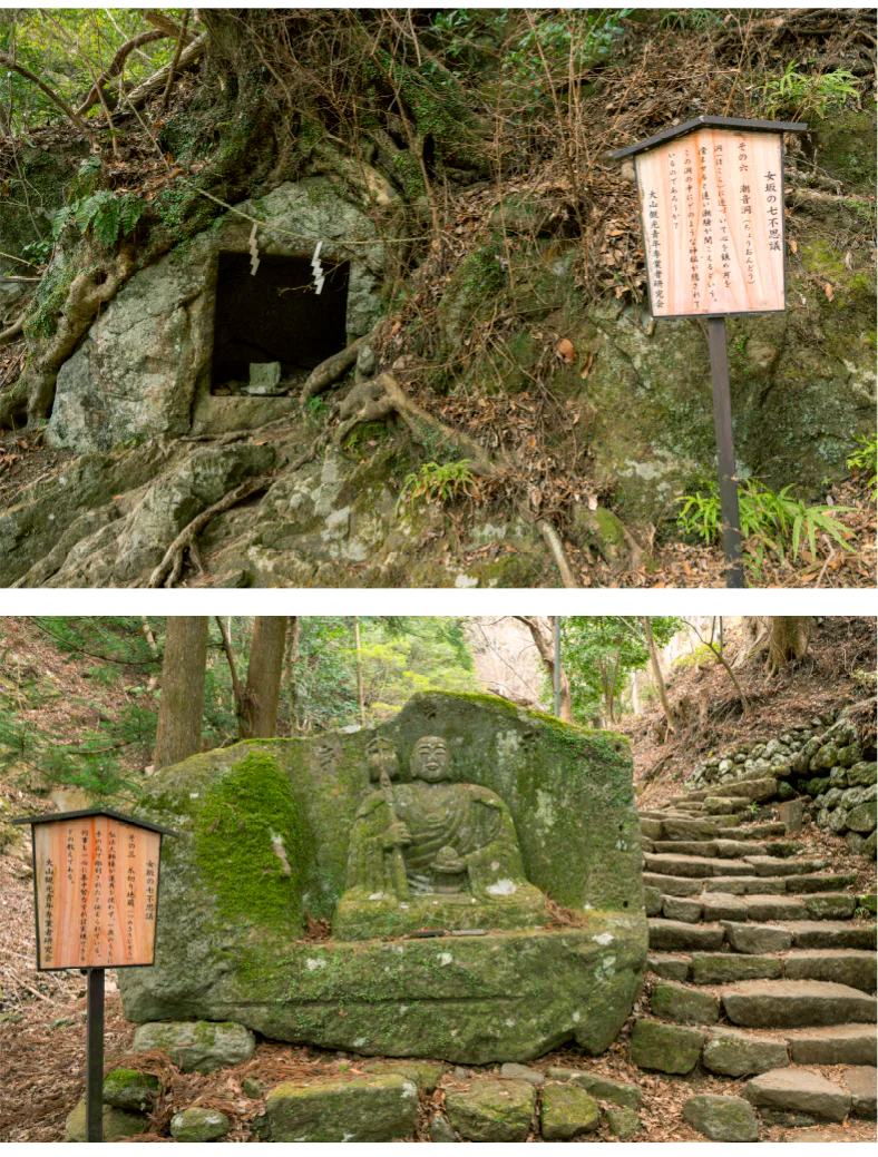 大山阿夫利神社下社から大山寺、こま参道までを結ぶ女坂には「女坂の7不思議」という7つの名所が点在する。下社に近い「潮音洞」(写真上)は岩盤の穴から遠く潮騒の音が聞こえるとか。しばし耳を澄ませてみよう。また、大山寺近くにある「爪切地蔵」(写真下)はかつて寺の住職を務めた弘法大師が道具を使わずに爪で彫り、一晩で仕上げたと伝えられる。