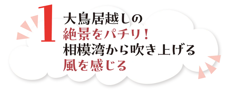 ケーブルカーを降りて階段を上ると、標高約700mの大山阿夫利神社下社に到着。ポイントは、大鳥居をくぐってから振り返ること。相模平野から相模湾、江ノ島や三浦半島、晴天なら房総半島までが見渡せる絶景が広がり、思わず息をのむ。大鳥居横のベンチで、霊山を吹き抜ける爽やかな風と眺望を楽しもう。