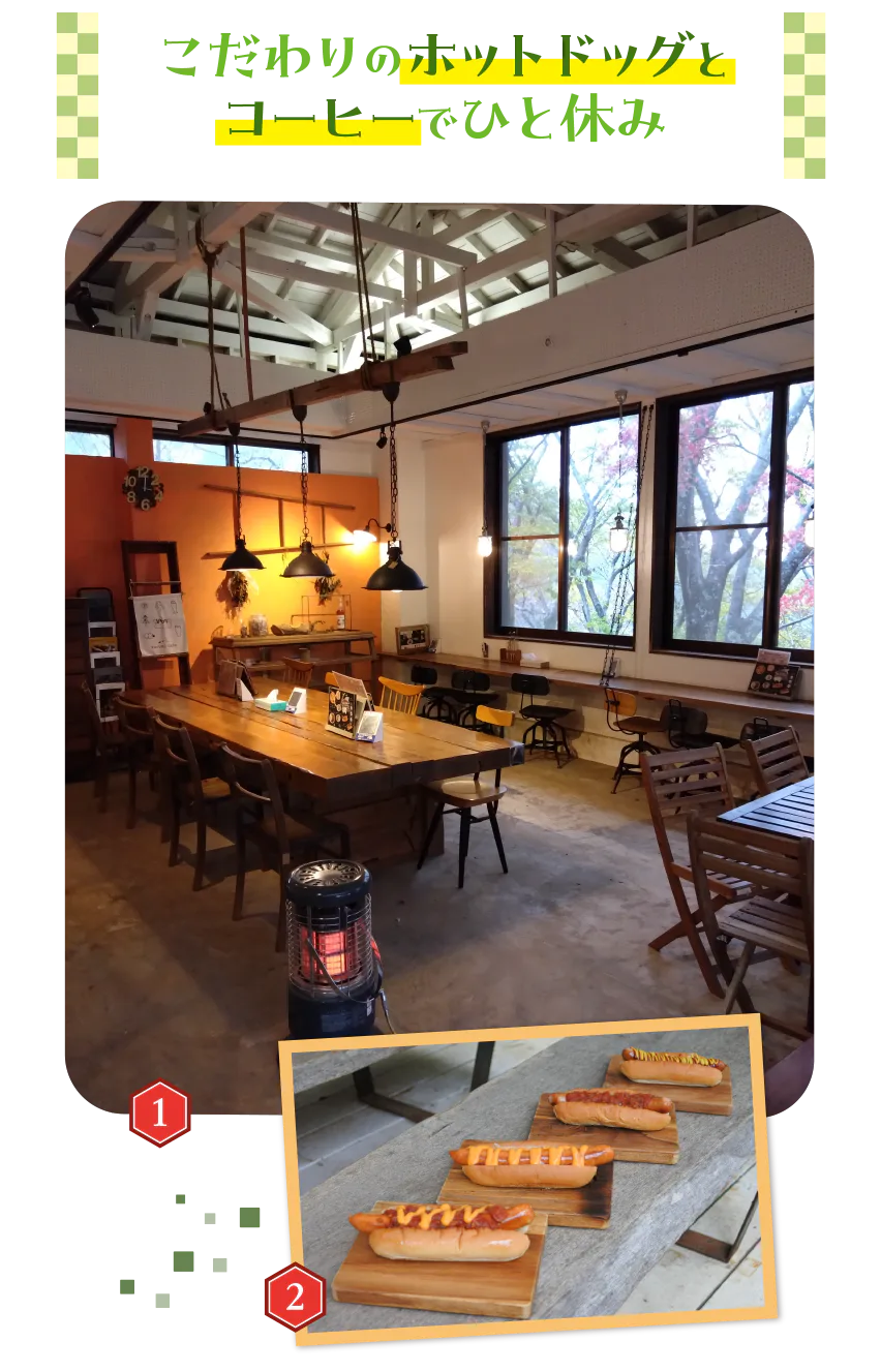 地元伊勢原の「やまと豚」を使った肉汁弾けるフランクフルトをサンドしたホットドッグが人気メニュー。4種類揃うホットドッグの他にも、ピザやカレー、ジェラートなどのメニューも揃う。大山の天然水仕立てのオーガニックコーヒー400円とともに頬張りたい。
