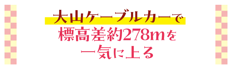 所要片道約6分。大山ケーブル駅~大山寺駅~阿夫利神社駅の3駅を結ぶ。最大傾斜は約25度。毎年1月には19時まで運行する夜景運転&沿線ライトアップが開催され、境内から眺める夜景の美しさは格別。大山ケーブル駅売店では、大山の形を模したオリジナルスイーツ「フォンダン・オ・ペカン」350円を販売。濃厚なチョコの風味がたまらない。