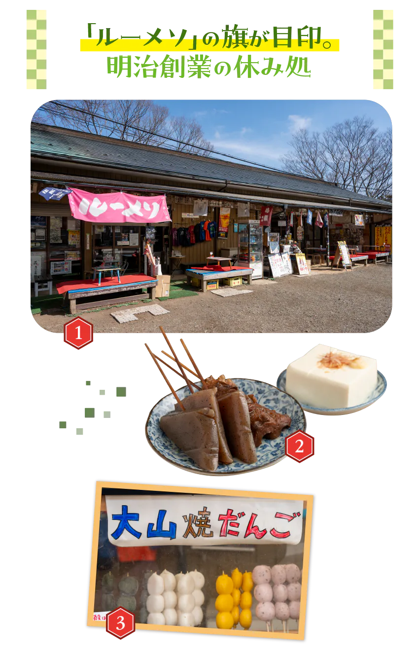 1.ラーメンの旗をヨコにかけたことから「ルーメソ」に。大山阿夫利神社参拝者にはもはやお馴染み 2.おでん1皿500円は一味で味わう 3.名物のだんご各500円。おすすめは秘伝の味噌ダレの白だんご