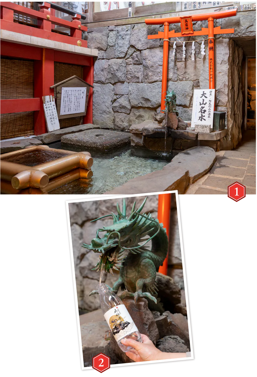 大山阿夫利神社下社の拝殿横、本殿に続く地下道(巡拝道)の奥にひっそりとあるのは、龍神様の口からあふれ出す大山名水「神泉」。山内に1カ所のみという貴重な水源から引水したもので、殖産・長命延寿のご利益があるとか。クセのない準硬水は飲用可能で持ち帰り自由。