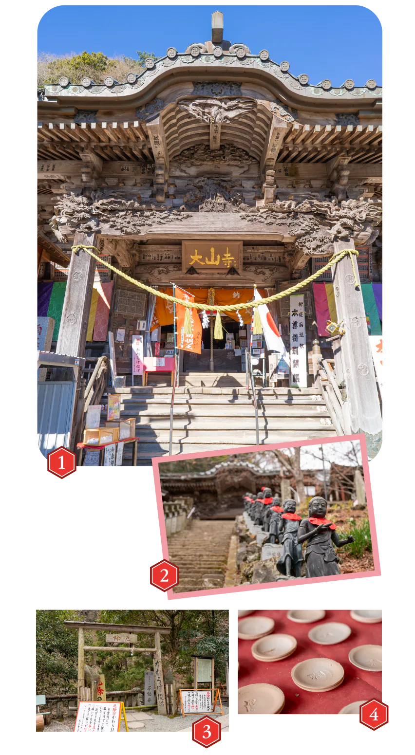 天平勝宝7(755)年、奈良東大寺の別当を務めた高僧・良弁(ろうべん)の開基とされる“大山のお不動さん”。試したいのは「かわらけ投げ」1回(2枚)300円。土器を輪の中に投げ入れるもので、「投げて厄を落とし、砕いて厄を払い、通して願いが叶う」ご利益があるとか。