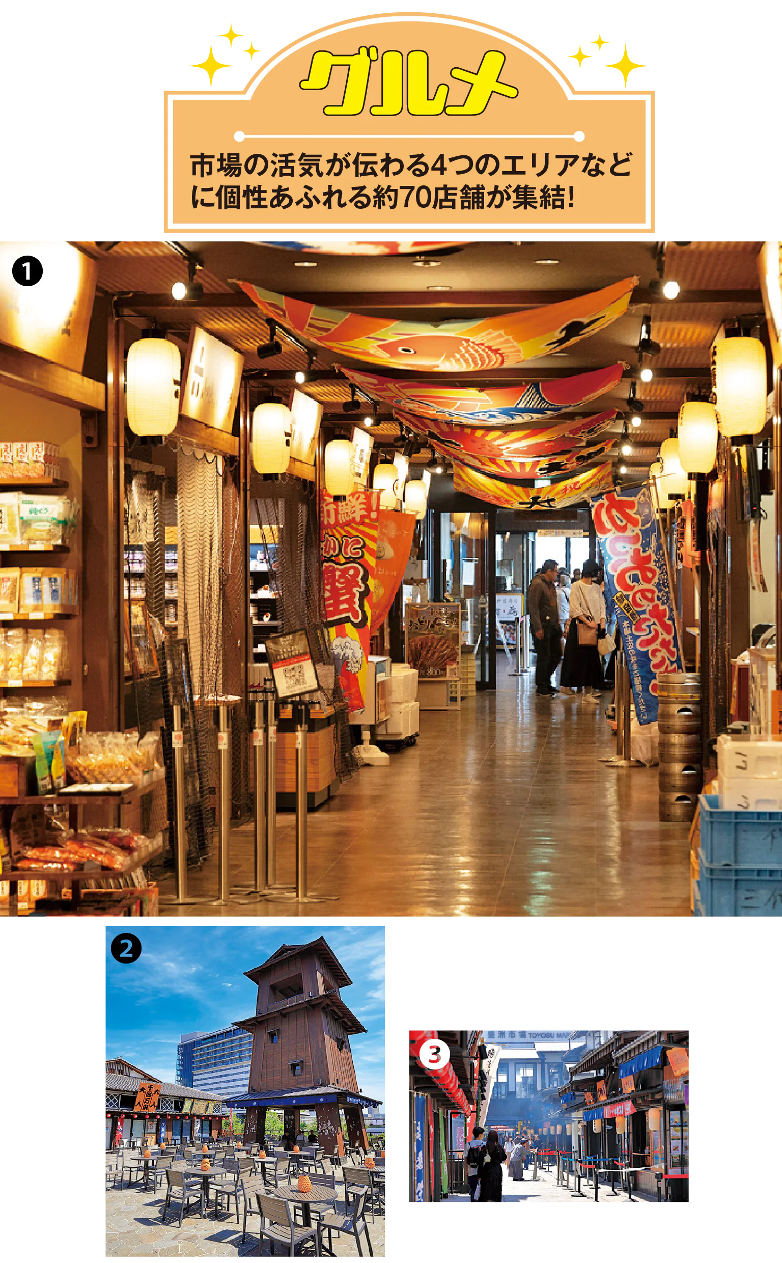 「豊洲江戸前通り」、「豊洲目抜き大通り」、「目利き横丁」、「よりどり町屋」の4エリアなどで構成。食べ歩きグルメや海鮮メニュー、スイーツなどの店舗が充実している。