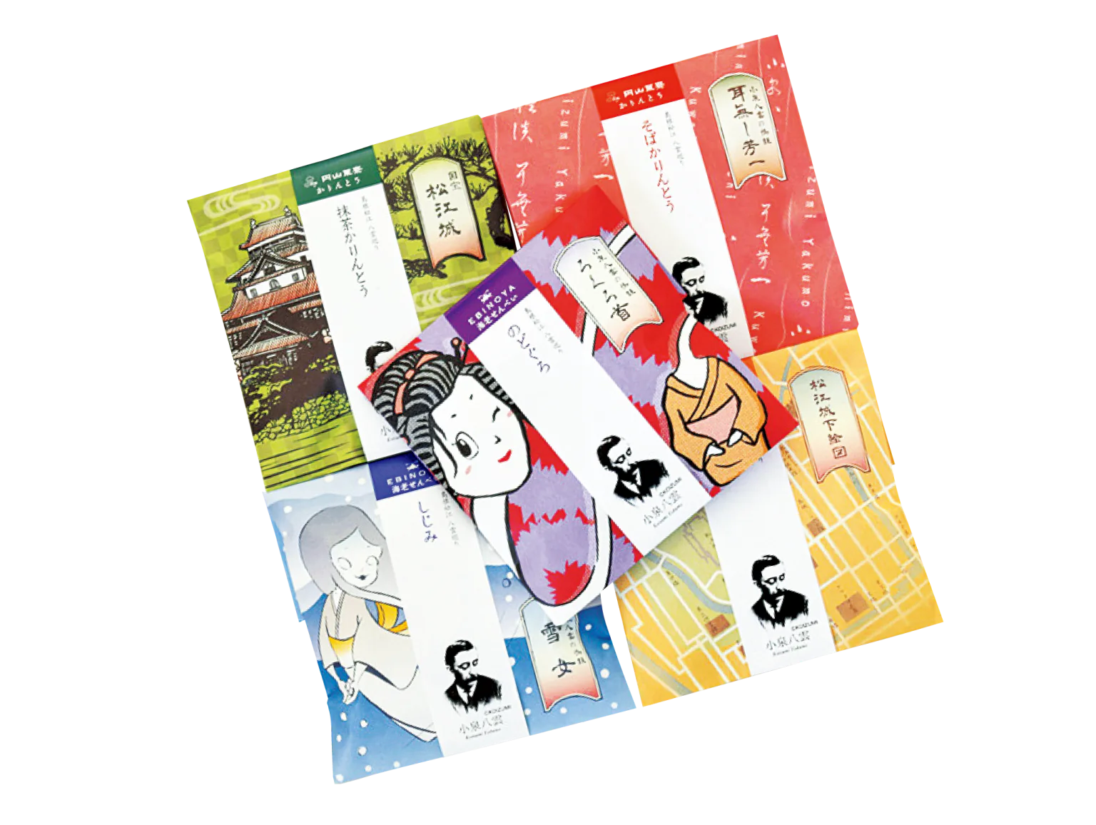 抹茶かりんとう(400円)。のどぐろせんべい(480円)など。小泉八雲の怪談シリーズや国宝松江城、松江城下絵図などが描かれた種類豊富な袋入り